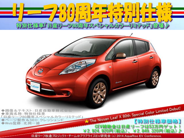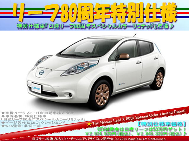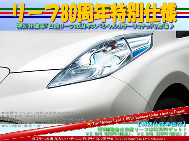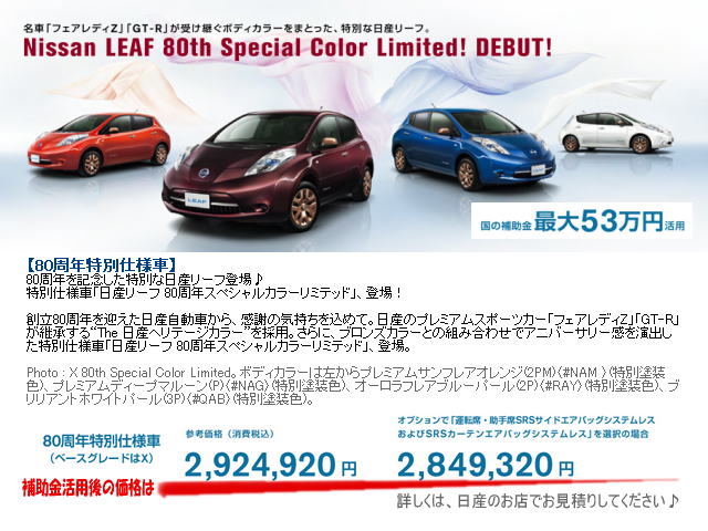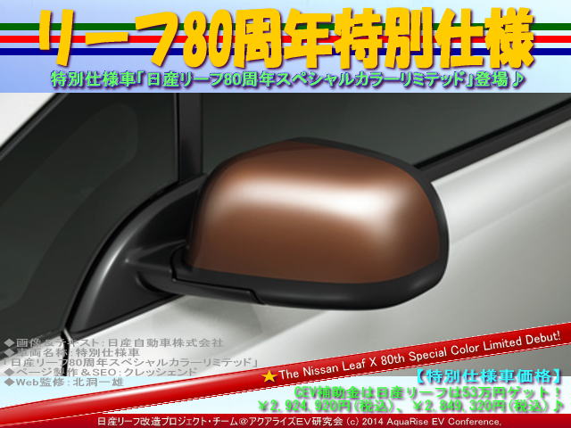 本日の紹介は、 <リーフ80周年特別仕様@日産リーフ改造>です。 日産リーフ特別仕様車「日産リーフ80周年スペシャルカラーリミテッド」登場♪ | ||||