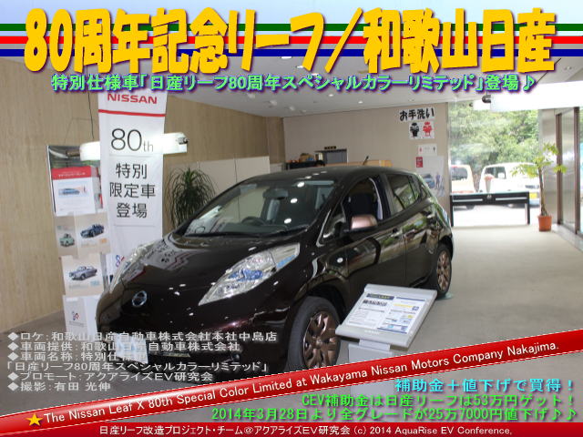 本日の紹介は、 <80周年リーフ/和歌山日産@日産リーフ改造>です。 日産リーフ特別仕様車「日産リーフ80周年スペシャルカラーリミテッド」登場♪ | ||||