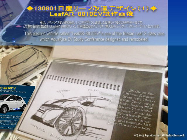 本日8月1日(木)の紹介は、 <日産リーフ改造デザイン>その(1)LeafAR-8810EV試作画像です。 この車は日産リーフの改造車です。 アクアライズEV研究会のみんなで、何百枚ものラフスケッチを描き起こして、その中なら厳選。そしていくつかデザインし改造した日産リーフGクラスの中の一つです。 この日産リーフの改造車の名前の表記は、<LeafAR-8810EV>で、日本語読みは<リーファー隼人EV(リーファー・ハヤト・イーヴイ)>といいます。 |