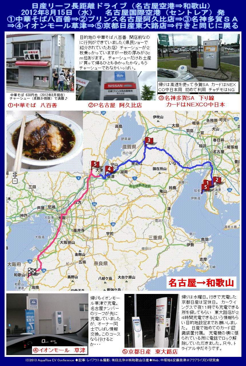 | 帰りは水曜日。行きで充電した京都日産十条店は定休日。 日産リーフのナビから、カーウイングスで夜11時でも充電できる所を探してもらい、京都日産東大路店が24時間充電できるという情報をゲット。 ナビで目的地設定までお願いしました。 日産で始めてのカード認識装置付属。充電機の横に張られている所に電話をして、遠隔操作でロック解除していただきました。 その節は、ありがとうございました♪ また、イオンモール草津で帰りも充電。名古屋ナンバーのリーフが先に充電していましたが、オーナー同士でしばし情報交換。このコースなら行けるとか・・・あれこれ。 日産リーフのオーナー同士は、初対面でもなんか臆せず話せる雰囲気が・・・。これぞ日産リーフの御蔭で一期一会の出会いで、新しい世界が広がっていきます。 日産リーフで、今回も良い経験になりました♪ EV電気自動車の電欠や充電の問題は、日産リーフユーザーでなくても心配するところですが、いざリーフを買って乗ってみると、リーフで遠出は案外楽しいものです♪ 昨日の和歌山から名古屋空港への往きでは、やらトラブルも楽しい旅の経験としてとらえる心の余裕が、ボクを含めて今の日本人に必要かも?と開き直って哲学的に・・・と勉強になりました! 日産リーフカスタムで、ライトやランプをLED化すると、走行距離が伸びて、電費を向上させると、長距離運転も気が楽になります。 ★ルームランプのLED化はこちら⇒ ★マップランプLEDはこちら⇒ 今回の<リーフ長距離運転/名古屋空港>ドライブは、2012年8月14日の火曜日から8月15日(水)の1泊2日の旅でした。 【行き】の詳しい記事はこちらをご覧下さい・・・⇒ 【帰り】の詳しい記事はこちらをご覧下さい・・・⇒ |