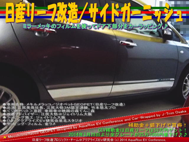 日産リーフを改造カスタムしているアクアライズEV研究会が自信を持って製作したカスタムカー<メキルメラッコ/ジオペット GEOPET>号は、特許庁に<意匠登録>を出願済みです。 3月末消費税8%アップ前、正確には2014年3月31日(月)に駆け込み施工したアクアライズEV研究会の日産リーフ改造/ジオペット GEOPETの自慢のラッピングの一つに、本日のサイドガーニッシュがあります。 サイドガーニッシュと大雑把に表現しているのは、左右前後のドア下4箇所をミラーメッキシルバー(又はミラークロームメッキ)でカーラッピングすることを総称するためです。 このサイドガーニッシュ・ミラーメッキシルバー(又はミラークロームメッキ)のカーラッピングは、ジェイトリム大阪の頼れるアーティザン・竹本悠太プロが責任施工しました。 日産リーフ改造/サイドガーニッシュデザイン原案は、映画の森てんこ森代表・幸田幸さんですが、この日産リーフ改造/サイドガーニッシュデザインには、ジェイトリム大阪の江尻大悟3M認定講師先生や竹本プロから色々アドバイスいただきました。サイドガーニッシュで日産リーフ改造デザインが一層良くなりました♪ | ||||