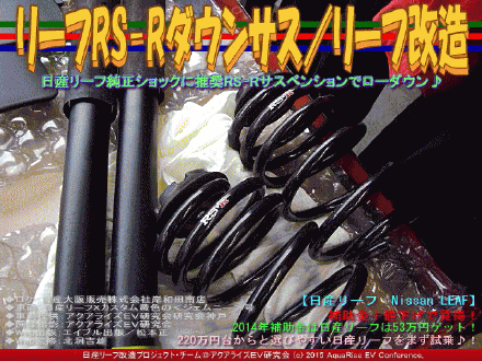 当アクアライズEV研究会では、今までに、日産リーフ改造カスタムコンプリートカー製作で車高を下げて<ローダウン><ダウンサス>を施したアクアライズEV研究会の日産リーフ改造カスタムコンプリートカーでは、アール・エス・アール<RSR(RS☆R)>社の<コイル/スプリング/バネ>製品を使って日産リーフSガンメタの<ジオペット GEOPET>号、リーフX黄色と黒のツートン<ジェムニー GEMNEA>号の車高を少しだけ下げています。 次回は機会を改めて、この三社の<車高調>を研究して、2014年秋の新作発表で展示する予定の当アクアライズEV研究会神戸所有の日産リーフ改造カスタムコンプリートカー<ジェムニー GEMNEA>に試着させようと思います。 ※日産リーフ改造カスタムコンプリートカー『ジェムニー』について詳しい情報は・・・⇒現在鋭意・順次作成中 | ||||