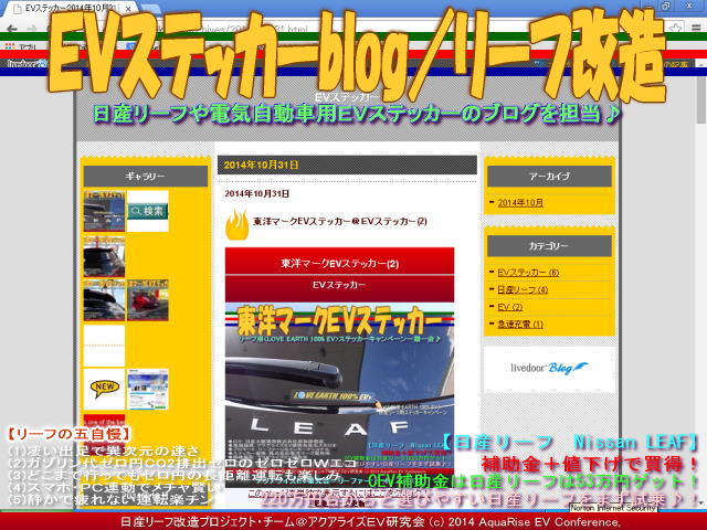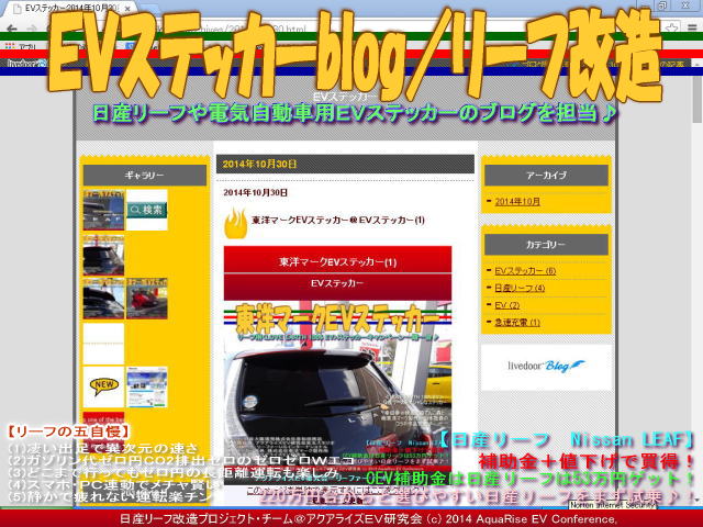 今日は『EVステッカーblog/リーフ改造』の紹介です。 当アクアライズEV研究会の新メンバーが初めて『EVステッカーblog/リーフ改造』ページを担当! 先日立ち上げた『日産リーフのブログ』と本ページ『EVステッカーblog』の両方をセットで作成してもらうことになりました! | ||||
