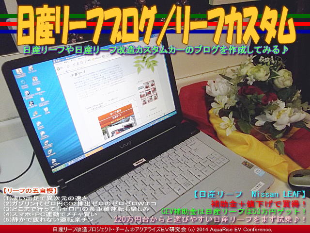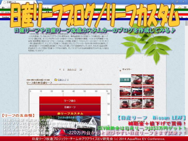 今日は『日産リーフの五自慢/リーフカスタム』の紹介です。画像タイトルは『日産リーフブログ/リーフカスタム』です。 先日立ち上げた『日産リーフブログ』では、当アクアライズEV研究会の立ち居地と目標を書きました。 | ||||