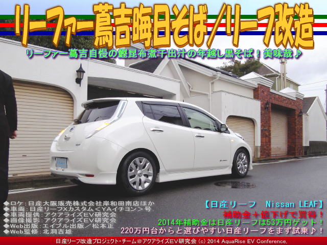 | ◆ロケ:日産大阪販売株式会社岸和田南店ほか ◆車両:日産リーフXカスタム<YAイチヨン>号 ◆画像編集:中塚裕@アクアライズEV研究会 ◆プロモート:リーファーUSインターナショナル ◆Web出版:エイブル出版/松本正 ◆Web校正:北洞一雄 ◆Web監修:北洞吉雄 | ||||