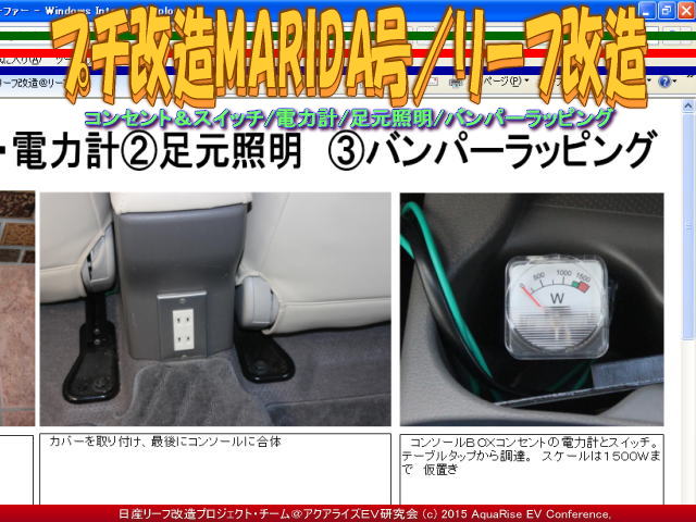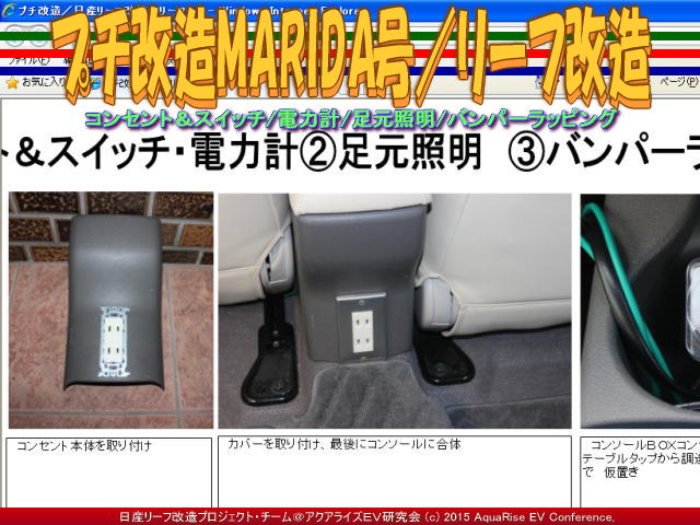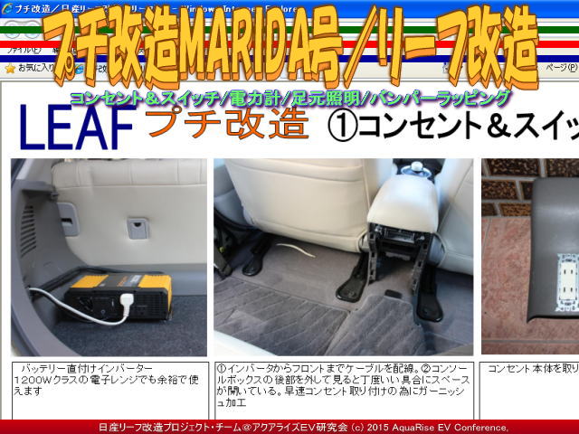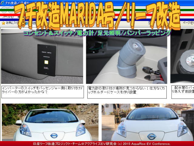 日産リーフのプチ改造一連のファイルは、このファイルを含んで、先日より 『プチ改造MARIDA号/リーフ改造』 『プチ改造FBラッピング/リーフ改造』 『プチ改造足元LED照明(2)/リーフ改造』 『プチ改造足元LED照明/リーフ改造』 『プチ改造YAZAWA電力計/リーフ改造』 『プチ改造DC・ACリモコン/リーフ改造』 『プチ改造コンセント/リーフ改造』 『日産リーフで電気毛布/リーフ改造』 『リーフ改造/家庭用コンセント取付』 と作成してきています。 <リーファー>サイトの『LEAFプチ改造/リーフ改造』ページとあわせてご覧頂ければ幸いです。 本<プチ改造>シリーズでは、日産リーフを自分好みのスタイルや使い勝手にしたいという、極めてシンプルな欲求から生まれたあれこれのアイデアを大切に育んで、そのアイデアを実現するために創意工夫されています。 もちろん、このドレスアップ日産リーフ改造カスタムコンプリートカーは、<プチ改造>と謳いながら結構大掛かりな改造を行っている場合もあります。 とりわけ、リーフ車内で家庭用電気製品を使用するという目的で取り付け配線したDC/ACインバーター1500W関連では、コンセントやリモコンや電力計の取り付けなど、EV日産リーフについてレベルの高い知識や製作能力を持ったリーフのプロ、ヘビーリーファー有田氏自らが行い、搭載してからの動作確認を日常の運転の中で検証もしています。 最近日産リーフのパーツが徐々に増えてきていますが、この日産リーフのプチ改造一連のファイルが、リーファー(リーフ乗り)さんのプチ改造のお手本・見本になれば幸いです。 | ||||