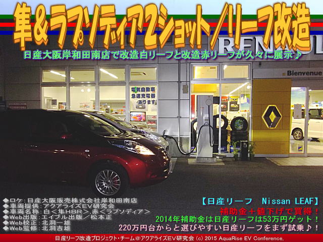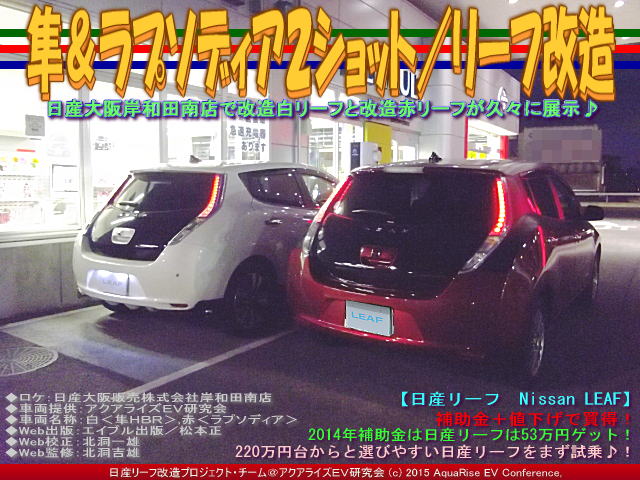 日産大阪販売株式会社岸和田南店は、略して<日産大阪岸和田南店>とか<日産岸和田南店>と私たちは呼んでいます。この日産大阪岸和田南店には急速充電(『リーフ急速充電/日産岸和田南』で案内)があります。でもオールナイト営業ではなくて、お店が開いているときだけ利用できます。 日産大阪岸和田南店では、昨年2014年10月から今年2015年の毎週土日祝日には、アクアライズEV研究会神戸が所有する、リーフX黒=スーパーブラック〈#KH3〉を黄色でドレスアップした日産リーフ改造カスタムコンプリートカー<ジェムニー GEMNEA>号を展示して、日産が世界に誇る電気自動車EVリーフの販売促進のお手伝いをボランティアで行っています。 <ジェムニー GEMNEA>号は、『リニューアル・オープン/日産大阪和泉中央』『決算セール/日産大阪泉大津店』『リーフ黄色/日産大阪岸和田南』『リーフ黄色/ジェムニー仕様』『リーフシートカバー/黄色@リーフカスタム』『リーフ大商談会/日産大阪岸和田南』『リーフ大商談会(2)/日産大阪岸和田南』『カーボン調ドルフィンアンテナ/リーフ改造』『リーフRS-Rダウンサス(2)/リーフ改造』『リーフTi2000ダウンサス(2)/リーフ改造』等のページで紹介してあります。あわせてご覧いただければ幸いです。 あ、今日は<ジェムニー GEMNEA>号のお話ではありません。2月14日バレンタイン・デイと15日(日)の二日間この日産大阪岸和田南店に、久々に<ラプソディア Rapsodia>号を展示しました。<ラプソディア Rapsodia>号は、リーフS赤=ラディアントレッド(PM)〈#NAH〉を黒色ワニ革柄フィルムでドレスアップした日産リーフ改造カスタムコンプリートカーです♪製作者でありデザイナーの幸田幸@映画の森てんこ森さんがとっても気に入っているカスタムカーです。 そして、<隼・ハヤブサHBR>号も一緒に並べてツーショット撮影しました。<隼・ハヤブサHBR>号はリーフG白=ブリリアントホワイトパール(3P)〈#QAB〉を2012年から2013年にかけて改造したリーフカスタムカーです。雨風や洗車機や屋外展示の過酷な環境にもにびくともしない耐用年数が長いラッカーペイントを施してカスタムカラーリングしています。 この<ラプソディア Rapsodia>号と<隼・ハヤブサHBR>号を一度に同じ店で撮影する機会はあまりないので、今回は貴重なツーショットを楽しみました♪ 因みに、今回紹介した日産大阪販売株式会社岸和田南店の関連ファイルは、2014年4月以降では、このページを含んで、 『隼&ラプソディア2ショット/リーフ改造』 『リーフ車高調サスTi2000/リーフ改造』 『リーフTi2000ダウンサス(2)/リーフ改造』 『リーフTi2000ダウンサス/リーフ改造』 『リーフRS-Rダウンサス(2)/リーフ改造』 『リーフRS-Rダウンサス/リーフ改造』 『リーフ改造車高調(3)/日産岸和田南』 『リーフ改造車高調(2)/日産岸和田南』 『リーフ改造車高調/日産岸和田南』 『リーフ専用車高調/日産岸和田南』 『リーフ改造ツーショット/日産岸和田南』 『リーフ改造ジズモエウロ(2)/日産岸和田南』 『リーフ改造ジズモエウロ/日産岸和田南』 『リーフ改造クリスマス/EV研究会』 『雨のリーフ/日産大阪岸和田南』 『EVテスラとジェムニー/リーフ改造』 『リーフ大商談会(2)/日産大阪岸和田南』 『リーフ大商談会/日産大阪岸和田南』 『リーフ急速充電/日産岸和田南』 『GT-Rと改造リーフ/日産岸和田南』 『GT-R/日産大阪岸和田南店』 『リーフ黄色/日産大阪岸和田南』 『リーファーの一期一会@リーファーUS』 『リーフ25万円値下げ/日産大阪岸和田南店@日産リーフ改造』 『リーフカスタム@日産大阪岸和田南』 等、その他数多くアップしてあります。 あわせてご覧いただければ幸いです♪ | ||||