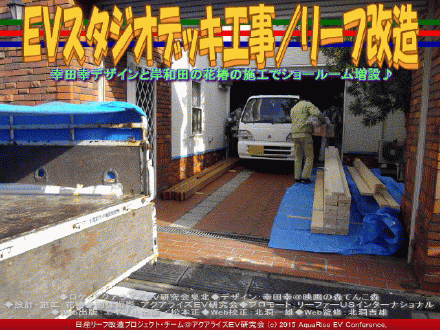 アクアライズEV研究会=リーファー・ドット・ユーエスは、日本が誇る電気自動車EV日産リーフに魅せられて「おもろいな♪EV社会がくればいいな♪」から始まって立ち上げた同好会的ボランティア団体です。現在大阪八尾市を本部として、車好きのスタッフが日産リーフ改造@アクアライズEV研究会やリーファーUSやEVステッカーや東洋マーク関連のサイト運営を通じて、地球と人間に優しい電気自動車の普及とゼロエミッション活動を通して「人と人とのつながり一期一会」のすばらしさを実感しています。 アクアライズEV研究会=リーファー・ドット・ユーエスは、2015年2月現在までに、日産リーフ改造カスタムコンプリートカーとして日産リーフをドレスアップ!<ハヤブサ>号<メキルメ>号<メキルメラッコ>号<ラプソディア>号<ハヤブサ隼HBR>号<ジオペット号>号<ジオノア-R>号<ジオノア-B>号や<ジェムニー>号、そして<ジズモエウロ・カメレオン>号などを手がけ、ご縁あって、その数台を日産大阪販売株式会社や和歌山日産自動車株式会社の各店舗で展示してきています。 日産リーフが気に入って購入、リーフオーナーとしてリーフを運転しているリーファーの皆さんと急速充電スポットや日産のお店でよくお会いしていると、いつの間にか親近感が湧いてきてお話をします。そしてアクアライズEV研究会の日産リーフ改造カスタム情報を見てもらったり、情報交換していくうちに、ウチのスタジオに訪問してくれるお人や機会が多くなってきました。泉北スタジオはむさくるしいスタジオでカーラッピングや簡単なプチ改造を行ったりして手狭になってきていましたので、スタジオ増設を昨年から計画、忙しさの合間を見つけてはこの度やっと実際に工事を行うことができました。 スタジオ増設のアイデアは、リーフ改造カスタムカーを手がけている幸田幸@映画の森てんこ森さん。設計施工は大阪府岸和田市にある花椿(はなつばき)というお洒落な名前のガーデニングの会社です。花椿(はなつばき)の社長さんはじめアドバイザーやスタッフの皆さんは建築はもちろんのこと、庭園やガーデニングにとても詳しく、確かな設計と工事が自慢で地元では好評です。 ※花椿フリーコール 0120-121287 ※花椿さんについての記事 ※大工さんについての記事 明日の<EVスタジオデッキ工事(2)/リーフ改造>に続く・・・ | ||||