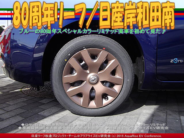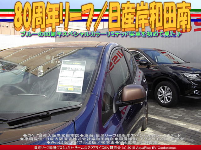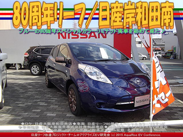 本日の紹介ファイルは『80周年リーフ(3)/日産岸和田南』です。 昨日の『80周年リーフ(2)/日産岸和田南』の続きです。 一昨日の『80周年リーフ/日産岸和田南』とあわせて、<80周年リーフ/日産岸和田南>シリーズ3作トリオロジーです。 「80周年リーフ」については、当アクアライズEV研究会は、今までに『80周年リーフ/和歌山日産@日産リーフ改造』と『リーフ80周年特別仕様@日産リーフ改造』で紹介してありますので、あわせてご覧いただければ幸いです。 | ||||