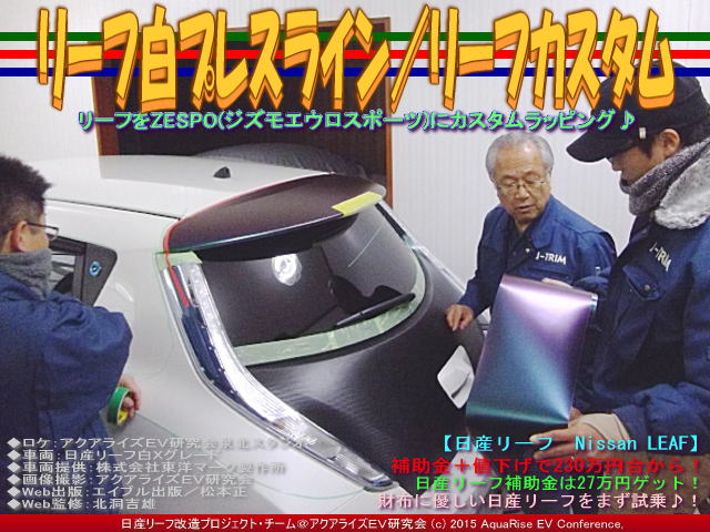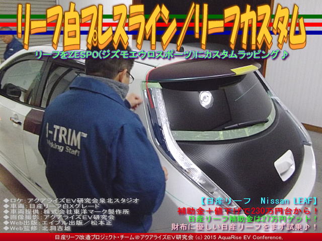 今日の紹介は、『リーフ白プレスライン(2)/リーフカスタム』です。 昨日の『リーフ白プレスライン/リーフカスタム』の続きです。紹介する画像のタイトルは統一して<リーフ白プレスライン/リーフカスタム>としています。 <日産リーフ白X>が<ZESPO ジズモエウロ・スポーツ(バーチャル画像)>にドレスアップされていく過程を、今回はカーラッピング作業・とりわけナイフレステープを使ったプレスラインの形取りパート2の紹介です。 | ||||