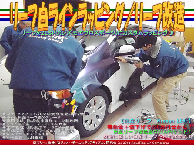 ◆ロケ:アクアライズEV研究会泉北スタジオ ◆車両:日産リーフ白Xグレード ◆車両提供:株式会社東洋マーク製作所 ◆ラッピング施工:ジェイトリム大阪 ◆施工管理:(株)東洋マークEV事業部 ◆画像撮影:アクアライズEV研究会 ◆プロモート:リーファーUSインターナショナル ◆Web出版:エイブル出版/松本正 ◆Web校正:北洞一雄 ◆Web監修:北洞吉雄 | ||||