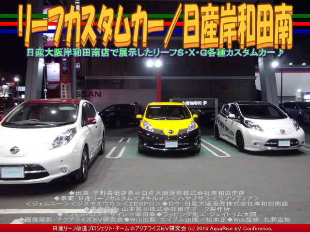 ◆出演:早野喜晴店長@日産大阪販売株式会社岸和田南店 ◆車両:日産リーフカスタム<メキルメ><ハヤブサ><ラプソディア> <ジェムニー><ジズモエウロ><ZESPO> ◆ロケ:日産大阪販売株式会社岸和田南店 ◆車両提供:山本篤@株式会社東洋マーク製作所 ◆<ZESPO>デザイン=幸田幸 ◆ラッピング施工:ジェイトリム大阪 ◆画像撮影:アクアライズEV研究会 ◆プロモート:リーファーUSインターナショナル ◆Web出版:エイブル出版/松本正 ◆Web校正:北洞一雄 ◆Web監修:北洞吉雄 | ||||
