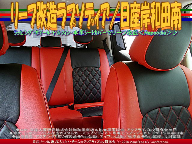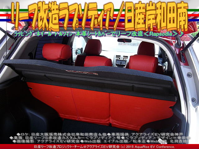 ◆車両:日産リーフS赤(ラディアントレッド) ◆改造カスタム車両:<Rapsodia ラプソディア>号 ◆ロケ:日産大阪販売株式会社岸和田南店&他 ◆車両提供:アクアライズEV研究会神戸 ◆<ラプソディア>デザイン=幸田幸 ◆画像撮影:アクアライズEV研究会 ◆プロモート:リーファーUSインターナショナル ◆Web出版:エイブル出版/松本正 ◆Web校正:北洞一雄 ◆Web監修:北洞吉雄 | ||||
