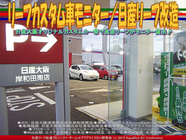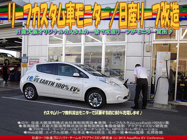 ◆ロケ:日産大阪販売株式会社岸和田南店 ◆車両:リーフカスタムLoveEarth100%EV車 ◆車両提供:日産大阪販売株式会社岸和田南店 ◆画像撮影:アクアライズEV研究会 ◆プロモート:リーファーUSインターナショナル、NPOエコ・レボリューション ◆Web出版:エイブル出版/松本正 ◆Web校正:北洞一雄 ◆Web監修:北洞吉雄 | ||||