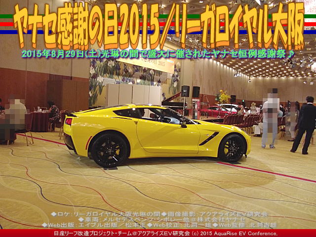 本日のブログ紹介は、『ヤナセ感謝の日2015(6)/リーガロイヤル大阪』です。 「ヤナセ感謝の日2015/リーガロイヤル大阪」の紹介は、このページを含んで。 ★ヤナセ感謝の日2015/リーガロイヤル大阪 ★ヤナセ感謝の日2015(2)/リーガロイヤル大阪 ★ヤナセ感謝の日2015(3)/リーガロイヤル大阪 ★ヤナセ感謝の日2015(4)/リーガロイヤル大阪 ★ヤナセ感謝の日2015(5)/リーガロイヤル大阪 ★ヤナセ感謝の日2015(6)/リーガロイヤル大阪 です。あわせてご覧いただければ幸いです。 今回の「ヤナセ感謝の日2015」には、黄色のシボレーコルベットクーペZ51が展示されていました。カッコ良かったです♪ ちなみに、前回2015年2月28日土曜日にやはり本会場リーガロイヤルホテル光琳の間で開かれた「ヤナセ100周年感謝のつどい」(『ヤナセ100周年リーガロイヤル大阪』紹介)では赤いコルベットでした♪ メルセデス・ベンツを主に販売するヤナセでも電気自動車、EVスマートが販売されています。 当アクアライズEV研究会は、主にリーフ、リーフ改造、リーフカスタム、e-NV200、テスラ、BMWi3EVのようなEV(電気自動車)関連記事を扱っていますが、ウチのスタッフでヘビーリーファー(リーフ乗り)でありながら、親子3代にわたってフェチ的メルセデス・ベンツ・ファンがいますので、御縁で紹介させていただきます。 今回も2015年8月29日(土)大阪中之島にあるリーガロイヤル大阪の光琳の間で「ヤナセ感謝の日2015」が開催されました。前回紹介しました『ヤナセ100周年リーガロイヤル大阪』シリーズはチーフのヒロコ先輩が取材とテキストを担当しましたが、29日30日と鈴鹿サーキットのGTレース(インターナショナル SUZUKA 1000km)会場に行ってますので、今回は私Annこと安藤奈津がファイル作成を担当させていただきます。 ちなみに、<EV電気自動車スマート>とスマートを販売する<メルセデス・ベンツ><ヤナセ>関連でアップした、今年2015年1月からのファイルは、 『EVディズニースマート(2)/EV研究会』 『EVディズニースマート/EV研究会』 『EV電気自動車スマート(2)/EV研究会』 『EV電気自動車スマート/EV研究会』 『ヤナセ100周年リーガロイヤル大阪』 『ヤナセ100周年リーガロイヤル大阪(2)』 『ヤナセ100周年リーガロイヤル大阪(3)』 『メルセデスベンツ初売り/ヤナセ岸和田』 があります。 あわせてご覧いただければ幸いです。 ※本ブログは、私たちボランティア団体である当アクアライズEV研究会(略称「AREVC」、別名:「リーフEV研」や「リーフ改造研」や「リーフ改造EV研」や「EV研究会」や「EV研」や「AREV神戸」)が中心となって作成。特定非営利活動促進法に基づき法人格を得た団体(特定非営利活動法人)<NPOエコ・レボリューション>の傘下で活動しています。 [テキスト:Ann__ ] | ||||