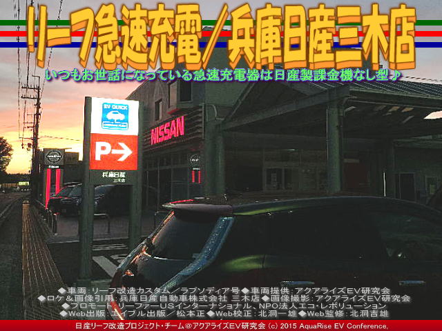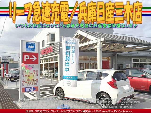 私は日産ZESPスタンダード会員で毎月お月謝のように自動引き落とししていますが、現在の日産のお店での急速充電では課金なしの無料でZESPスタンダード会員カードやパスワード入力で急速充電できます。お仕事柄一ヶ月に3千キロ以上走るドレスアップリーフ改造カスタムカー乗りの、いわゆるヘビーリーファー(『リーファー@日産リーフ改造』)の私にとっては、出先では手軽でありがたいことです。 【リーフ急速充電/兵庫日産三木店 01】 今日紹介している兵庫日産三木店は、正式名称は「兵庫日産自動車株式会社三木店(ひょうごにっさんじどうしゃかぶしきがいしゃみきてん)」といいます。2015年10月3日(土)現在は、『日産製新型急速充電器(3)/NPOエコ・レボリューション』などで紹介しました日産製の課金機なしの急速充電器スタンドが設置されています。兵庫日産三木店の充電スポットについて公式ページを引用して一部編集して以下に紹介します。 ※以下のデータは将来更新される場合がありますので、詳しくはお店や公式ページでご確認くださいませ。 □名称: 兵庫日産自動車株式会社三木店 □読み: ひょうごにっさんじどうしゃかぶしきがいしゃみきてん □住所: 〒673-0433 兵庫県三木市福井2138番地1 □Tel.: 0794-82-9232 Fax.0794-83-6424 □アクセス: アクセスマップ □公式ページ: トップページはこちらから □普通充電と急速充電情報: 普通充電は日産車のみ充電可。急速充電はCHAdeMO急速充電器プロトコルに対応したEVのみ充電可。(法人のお客さまも利用可)、日産ゼロ・エミッションサポートプログラム会員は、無料。店舗での対応は「スタッフがお預かりして充電いたします。夜間車両預かりや実施しておりません。利用電話予約 ご予約は承っておりません。 ★普通充電器情報: ・充電タイプ=普通充電(ケーブル無)・・・ケーブルをご準備の上、ご来店ください。 ・コネクタタイプ=普通充電(ケーブル無)国内平型200V ・料金=60分108円(税込み) ・充電サービス利用時間=10:00~19:00 ★急速充電情報: ・充電タイプ=急速充電 ・コネクタタイプ= 国内急速充電タイプ ・料金=30分540円(税込み、但し日産ZESP会員は無料) ・充電サービス利用時間=24時間 【リーフ急速充電/兵庫日産三木店 02】 兵庫日産三木店の公式ページを見ると、<ショールームをリニューアルしました!広い展示場は、多彩な日産車をご覧頂けます。常時10台以上の試乗車をご用意しております。キッズコーナー・火曜日のレディースデーなど、女性目線でのおもてなしやお店作りを心がけています。きれいになった三木店にぜひ、お越し下さい。ご来店をスタッフ一同お待ちしております。>とあります。 【リーフ急速充電/兵庫日産三木店 03】 私は、2015年7月19日の夏の日に<以前にもここで紹介したことのある、兵庫日産三木店で充電しました。残念ながらこの日は水曜日で、定休日でした。三木市福井、県道22号線に沿ったところにあります。この近くには、他に充電できるところが見当たらず、貴重な充電スポットです。充電が終わって、ふと目が覚めたら、もう夕暮れでした。>と書いたことがあります。 【リーフ急速充電/兵庫日産三木店 04】 ちなみに、アクアライズEV研究会サイトの急速充電や新急速充電(QC)そして普通充電の関連ブログページは、本ブログページを含めて、 『リーフ急速充電/兵庫日産三木店』 『日産製新型急速充電器(3)/NPOエコ・レボリューション』 『日産製新型急速充電器(2)/NPOエコ・レボリューション』 『日産製新型急速充電器/NPOエコ・レボリューション』 『リーフ急速充電/イオンモール神戸北(2)』 『リーフ急速充電/イオンモール神戸北』 『リーフ急速充電/神戸エコール・リラ』 『リーフ急速充電/ダイエー藤原台店』 『リーフ急速充電/舞鶴若狭自動車道西紀SA』 『リーフ急速充電/(2)蒜山高原風の家』 『リーフ急速充電/蒜山高原道の駅風の家』 『リーフ急速充電/米子自動車道蒜山高原SA下り』 『リーフ急速充電/中国自動車道勝央SA下り』 『リーフ急速充電/中国自動車道加西SA下り』 『リーフ急速充電/加古川医療センター』 『リーフ急速充電/名神高速道路桂川PA』 『リーフ急速充電/名神高速桂川PA上り』 『リーフ急速充電/神戸umieウミエ(3)』 『リーフ急速充電/神戸umieウミエ(2)』 『リーフ急速充電/神戸umieウミエ』 『チャデモCHAdeMO急速充電(3)/EV研』 『チャデモCHAdeMO急速充電(2)/EV研』 『チャデモCHAdeMO急速充電/EV研』 『リーフ急速充電/西宮名塩SA』 『リーフ急速充電/西宮名塩SA上り』 『リーフ急速充電/西宮名塩SA下り』 『リーフ急速充電/山陽道三木SA(下り)』 『リーフ急速充電/第二神明道路明石SA』 『リーフ急速充電/阪神高速湾岸線中島PA』 『リーフ急速充電/日産大阪豊中北』 『eNV200急速充電/日産河内長野南』 『eNV200急速充電/日産大阪高石』 『eNV200急速充電/日産大阪貝塚北』 『eNV200急速充電/日産大阪八尾』 『eNV200急速充電/日産大阪堀江』 『リーフ急速充電/日産大阪堀江』 『リーフ急速充電/日産大阪住之江』 『ドイツEV充電シ