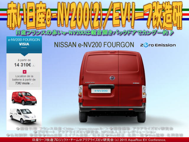 ・・・昨日のブログ『赤い日産e-NV200/リーフEV研』の続きは以下です。 今回のブログで紹介している日産フランス(フランス日産)の公式サイトで見つけた赤色のe-NV200のバンタイプは結構イケてると思います。赤色のボディに黒色のバンパーで赤と黒のコントラストが利いていて、後ろ姿の観音開きバックドアのスタイルがルノーカングーのようでフランスっぽくお洒落に感じます。この赤色は、フレーム・レッド=Rouge Toscane ルージュトスカーヌ(O)<#Z10>という日産色です。 ちなみに、e-NV200 Fourgon(e-NV200バンタイプ)のいろいろなボディカラーはここをクリックでビデオが見れます。 ※mp4ビデオはこちら→ ※webmビデオはこちら→ 【赤い日産e-NV200(2)/EVリーフ改造研 01】 以前日産大阪河内長野南店(『eNV200急速充電/日産河内長野南』)と日産大阪八尾店(『eNV200急速充電/日産大阪八尾』)の取材で大阪外環(R170)を走っていた時に、日産NV200をカンパニーカラーの赤と白抜きの<HILTI>ロゴでカスタムドレスアップした有名な日本ヒルティ社の営業車に出くわしました。これだ!と思いました。 【赤い日産e-NV200(2)/EVリーフ改造研 02】 日本の日産e-NV200も、今回、12月10日頃に発売予定の新型リーフ2015バージョンのようにマイナーチェンジして、30キロワットの増量バッテリーを積んで、衝突回避および衝突時の被害低減を支援する、今流行の「エマージェンシーブレーキ」と走行中の車線逸脱回避を支援する「LDW(車線逸脱警報)」を全車標準装備して、赤色のボディカラーも追加ラインナップすればいいのになあ~と思います。たしか2010年頃?のガソリン車のNV200バネットには、赤色がラインナップされていたと思いますけど・・・。 【赤い日産e-NV200(2)/EVリーフ改造研 03】 いえいえ、いっその事、カッコいいスカイライン(参照『スカイライン200GT-t(3)/日産岸和田南』)でオプション設定している、高速道路や自動車専用道路で使用することを前提に開発された定速走行・車間距離制御装置 =車間距離を一定に保ちつつ、定速走行を車が自動でやってくれる(ACC:Adaptive Cruise Control アダプティブ・クルーズ・コントロール)と「LDW(車線逸脱警報)」だけでなく、車線を逸脱したら自動で戻してくれるLKA(Lane Keeping Assist system レーン・キーピング・アシスト・システム)も装備してください。自動運転機能の代表である日産自慢の「ASV(先進安全自動車)」装備した、世界初の最高のミニバンe-NV200(参照『日産e-NV200は世界初の電気ミニバン』)をリリースしてほしいなあ~。やっちゃえ日産!デス。 【赤い日産e-NV200(2)/EVリーフ改造研 04】 えっ、何?!買えないくせに、お前、何勝手なことを言ってるんだ!(`ω´) !と日産の方に叱られるかも知れません・・・スミマセンm(_"_)m。 噂に聞くと、日産のe-NV200は値段が高い上に短い走行距離のダブルイマイチのせいで、売れないクルマらしいです。じゃ、テスラのように最低70キロワットのバッテリーを積んで、内装はめちゃ豪華なオフィスカー兼キャンピングカーにするか、日産が現時点で装備できる限りのめっちゃ先進的な安全機能がついたミニバンにして、メルセデスベンツ(『ヤナセ感謝の日2015/リーガロイヤルホテル大阪』)の中級車やテスラ(参照『テスラ心斎橋(3)/NPOエコ・レボリューション』)モデルSのように700万円以上の高い値段をつけて話題作りや客寄せパンダ的クルマにした方がましかもよ!なんちゃって・・/(^_^;)>。 【赤い日産e-NV200(2)/EVリーフ改造研 05】 先日より、日産フランス(フランス日産)のe-NV200ページを楽しく閲覧して・・・続く ・・・次回の『日産e-NV200(3)/EVリーフ改造研』につづく ちなみに、当アクアライズEV研究会では、今までに<日産e-NV200>関連ファイルとして、このファイルも含んで、 『赤い日産e-NV200(2)/EVリーフ改造研』 『赤い日産e-NV200/リーフEV研』 『eNV200急速充電/日産河内長野南』 『eNV200急速充電/日産大阪高石』 『eNV200急速充電/日産大阪貝塚北』 『eNV200急速充電/日産大阪八尾』 『eNV200急速充電/日産大阪堀江』 『リーフでNV200をEVコンバート改造(3)』 『リーフでNV200をEVコンバート改造(2)』 『リーフでNV200をEVコンバート改造』 『日産e-NV200は世界初の電気ミニバン』 等をアップしてあります。 あわせてご覧いただければ幸いです。 □テキスト:Ann & Megima__ | ||||