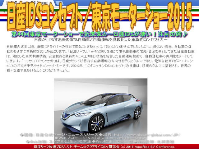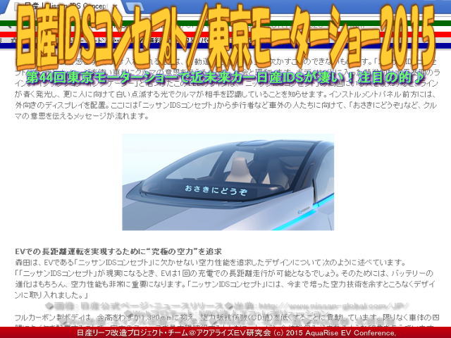 | ここをクリックでこのページだけ表示 ---最新ページ更新--- 【日産IDSコンセプト(5)/東京モーターショー2015】 日産リーフは今日も行く...ψ^c_^)ゞ | ||||