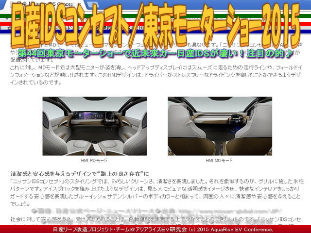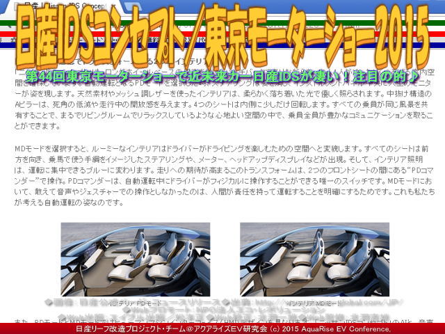 以上、日産IDSコンセプト(5)/東京モーターショー2015の各画像はクリックで全て640x480pxlsに拡大します。 ※本ブログの表示画像4枚をスライドショー320x240pxlsで見られます。 ※本ブログ5作シリーズのすべての表示画像14枚を320x240pxlsで見られます。 | ||||