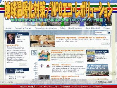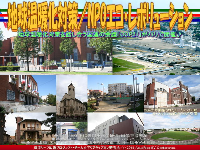 2015年11月30日から12月11日まで、フランス・パリ、詳しくはパリ北部の郊外、ノートルダム・ド・パリから約10.4km離れた人口13,610人(2008年調べ)の小さな町ル・ブルジェ (Le Bourget:イル=ド=フランス地域圏、セーヌ=サン=ドニ県のコミューン。1919年に開港したル・ブルジェ空港がある。コミューンの歴史はル・ブルジェ空港と密接につながっている。※Wikipedia引用)で、地球温暖化対策を話し合う国連の会議「COP21」、京都議定書第11回締約国会議(CMP11)が開催されています。 【地球温暖化対策/NPOエコ・レボリューション 01】 今回のCOP21では、世界195カ国の首脳が参加し、約2週間の会期中に2020年以降の地球温暖化対策の新たな国際的枠組みについて議論を重ね、先進国も発展途上国や新興国も納得のできる、実効性のある温暖化対策の枠組み合意を目指しています。日本を代表して安倍首相も頑張っている様子が見られます(※首相官邸の公式ページ参照)。 【地球温暖化対策/NPOエコ・レボリューション 02】 COP21の正式名称は「気候変動枠組み条約第21回締約国会議」です。COPの英語は”Conference of the Parties”で、条約に参加する国々の会議という意味。気候変動枠組み条約は、もともと1992年ブラジルのリオデジャネイロで開催された地球サミットで採択された条約で、参加国が地球温暖化防止のために国際会議を開くようになりました。 国連には地球温暖化の問題を考えるために1988年に設立された国連の組織で「IPCC」があります。英語で“Intergovernmental Panel on Climate Change”、日本語で「気候変動に関する政府間パネル」といいます。世界中から数千人の科学者が参加して、数年ごとに地球温暖化についての報告書を作成して公式発表しています。地球温暖化の原因と未来予測について(地球温暖化の自然科学的根拠)、地球温暖化の影響について(地球温暖化の影響・適応・脆弱性)、そして温室効果ガスの削減策について(地球温暖化の緩和策)の3つの報告書の内容を合わせた「統合報告書」が2014年10月に発表されています。 【地球温暖化対策/NPOエコ・レボリューション 03】 1997年12月、京都で開催された3回目の会議、いわゆるCOP3で、地球温暖化対策として、先進国に削減義務を課す、国際的な合意「京都議定書」が採択されました。この国際合意「京都議定書」は、先進国に対して温室効果ガスの削減を義務付ける画期的なもので、世界の温暖化対策はここから大きく前進するかと思われました。ところが、当時最大の CO2排出国であったアメリカが議定書から離脱しました。そして中国などの新興国からのCO2排出量が急増して、一部の先進国だけの排出削減義務では、効果が限定的なものとなってしまいました。結果的に、この第3回締約国会議(COP3、京都会議)においては、2000年以降の取り組みについての規定が不十分であるとして、法的拘束力のある数値目標を定める京都議定書が採択され、2007年12月3日にオーストラリアが京都議定書に調印、批准したため、先進国で京都議定書に批准していないのはアメリカ合衆国だけとなった経緯があります。 【地球温暖化対策/NPOエコ・レボリューション 04】 ちなみに、過去のCOP=気候変動枠組み条約締約国会議の歴史を見ると、 第1回締約国会議(COP1) 1995年3月28日 - 4月7日 ドイツ ベルリン 第2回締約国会議(COP2) 1996年7月8日 - 19日 スイス ジュネーヴ 第3回締約国会議(COP3) 1997年12月1日 - 10日 日本 京都 第4回締約国会議(COP4) 1998年11月2日 - 13日 アルゼンチン ブエノスアイレス 第5回締約国会議(COP5) 1999年10月25日 - 11月5日 ドイツ ボン 第6回締約国会議(COP6) 2000年11月13日 - 24日 オランダ ハーグ 第7回締約国会議(COP7) 2001年10月29日 - 10日 モロッコ マラケシュ 第8回締約国会議(COP8) 2002年10月23日 - 11月1日 インド ニューデリー 第9回締約国会議(COP9) 2003年12月1日 - 12日 イタリア ミラノ 第10回締約国会議(COP10) 2004年12月6日 - 17日 アルゼンチン ブエノスアイレス 第11回締約国会議(COP11) 2005年11月28日 - 12月9日 カナダ モントリオール 第12回締約国会議(COP12) 2006年11月6日 - 17日 ケニア ナイロビ 第13回締約国会議(COP13) 2007年12月3日 - 14日 インドネシア バリ 第14回締約国会議(COP14) 2008年12月1日 - 12日 ポーランド ポズナニ 第15回締約国会議(COP15) 2009年12月7日 - 18日 デンマーク コペンハーゲン 第16回締約国会議(COP16) 2010年11月29日 - 12月10日 メキシコ カンクン 第17回締約国会議(COP17) 2011年11月28日 - 12月11日 南アフリカ共和国 ダーバン 第18回締約国会議(COP18) 2012年11月26日 - 12月7日 カタール 第19回締約国会議(COP19) 2013年11月11日 - 22日 ポーランド ワルシャワ 第20回締約国会議(COP20) 2014年12月1日 - 12日 ペルー リマ 第21回締約国会議 (COP21) 2015年11月30日 - 12月11日 フランス パリ があります。2002年10月23日から11月1日開催の第8回締約国会議(COP8)では、途上国と先進国との対立が平行線を辿り、途上国の開発優先性をも重視することを念頭に置いた「共通だが差異のある責任」を再確認し、京都議定書の未批准国に対し批准を強く求める「デリー宣言」を