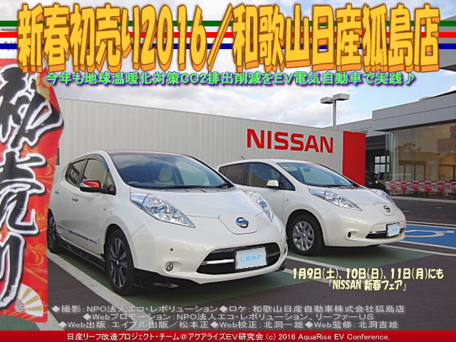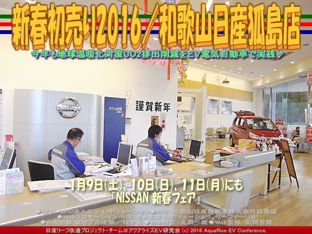 ・・・前回の『新春初売り2016/和歌山日産狐島店』の続きは以下です。 2016年の新春初売り第二弾として、1月9日(土)、10日(日)、11日(月)「和歌山日産 NISSAN 新春フェア」が和歌山日産狐島店でも催されています。今年の和歌山日産のお店の初売り第一弾<初夢フェア>は、先日紹介した兵庫日産岡場店の3日(日)・4日(月)・5日(火)ではなく、若干異なってお正月3日(日)と4日(月)の二日間だけ新春初売りを開催していました。この和歌山日産狐島店(正式名称:和歌山日産自動車株式会社狐島店/ わかやまにっさんじどうしゃかぶしきがいしゃ きつねじまてん)と和歌山日産の本社がある和歌山日産中島店の両店は、私たちが和歌山にお仕事に来る度に急速充電でお世話になっています。 【新春初売り2016(2)/和歌山日産狐島店 01】 当NPO法人エコ・レボリューションではスタッフのほとんどが日産リーフに乗っています。日産リーフは日産大阪、兵庫日産、和歌山日産のそれぞれのお店から購入して複数台ありますが、和歌山日産さんから2台のリーフを買っています。和歌山日産さんには、EV電気自動車に詳しい整備の方だけでなく、リーフマスターという肩書きをもった日産リーフにとても詳しい方がいらっしゃいます。ここの皆さんから日産リーフとうまく付き合う術(すべ)を沢山教えてもらいました。そのリーフマスターの肩書きをもった丸山さんから、今はこの和歌山日産狐島店の店長さんですが、和歌山日産中島店の店長さん時代に白リーフGとガンメタリーフSを購入。私たちでアクアライズEV研究会日産リーフ改造プロジェクト・チームを組んで、法定順守したカスタム改造して、ハヤブサ号やメキルメ号というドレスアップ日産リーフ改造カスタム・コンプリートカーに仕上げて、2013年のお正月に展示(『和歌山日産リーフ新春初売り@日産リーフ改造』『日産リーフカスタム/リーフ改造@和歌山日産』『メキルメ・ラッコ/和歌山日産狐島店@日産リーフ改造』『日産リーフ大商談会/和歌山日産大浦店@日産リーフ改造』)させていただきました。 【新春初売り2016(2)/和歌山日産狐島店 02】 以前『日産リーフの五自慢/リーフカスタム』ブログで書いていますが、世界で一番売れているEV電気自動車という日産リーフ(ルノー・日産アライアンス 累計25万台の電気自動車を販売)には、ガソリン車(ICEV)にはない長所と短所があります。2016年1月現在で市販されている日産リーフの長所は、ストレスのない驚くほど鋭い出足、車内はもちろんのこと騒音がほとんど出ない静かな走り、そして財布にやさしいとても安いランニングコスト、ガソリンを全く使わないCO2排出ガスゼロのゼロエミッションなどです。日産リーフに一度乗ったらもうやめられません。 【新春初売り2016(2)/和歌山日産狐島店 03】 日産リーフの短所は、走行距離が228キロから280キロ(※メーカー算出数値)と短いこと、そして今も日本国中でどんどん増えていっている、約16,000カ所あるといわれている充電スポット・充電スタンド(急速充電・普通充電)には、セルフのガソリンスタンドのように数か所の給油口にあたる、複数の給電口のある充電スタンドが少ないことです。この2点の短所はここ数年で解消されます。 【新春初売り2016(2)/和歌山日産狐島店 04】 和歌山日産さんは、和歌山県にある同社のすべての店舗に急速充電スタンドとニチコンのリーフツーホーム中速充電と200ボルトの普通充電器を設置しています。そして日産自動車本社のCSR(企業の社会的責任)としてSD(持続ある社会の発展)を目指して、EV電気自動車の日産リーフ(参照『日産リーフ新型2015(5)/リーフ改造研』『新型リーフ2015/リーフ改造研』)や世界初の日産電気商用車EVミニバンとして世界が注目したe-NV200(※参照『リーフでNV200をEVコンバート改造(3)』『赤い日産e-NV200(3)/リーフ改造研』『夢の日産EVバン改造/e-NV200』)の販売にも力を入れています。 【新春初売り2016(2)/和歌山日産狐島店 05】 私たちは和歌山日産さんからEV電気自動車日産リーフについていろいろなことを学びました。EV電気自動車日産リーフの限界ある走行距離の伸ばし方、長距離運転と急速充電スポット、リーフツーホームの運用の仕方、そしてEV電気自動車のバッテリーと車検や乗り替え、日産リーフの将来の見通しなど、EV電気自動車日産リーフの長所短所を見極めて日産リーフとうまく付き合っていくこと自体が、COP21の地球温暖化対策に地球レベルの観点で社会に貢献しているという自負につながります。これらはEV電気自動車日産リーフに乗って得られた別の意味での「走る喜び」です。私は時として、大袈裟かも知れませんが、日産リーフに乗ってQOL(人生の価値観)が若干変わったかも知れません。 ちなみに、和歌山日産についてのブログのアーカイブはこのブログページを含んで以下です。 『新春初売り2016(2)/和歌山日産狐島店』 『新春初売り2016/和歌山日産狐島店』 『リーフ急速充電/和歌山日産狐島店』 『リーフ・ツー・ホーム/和歌山日