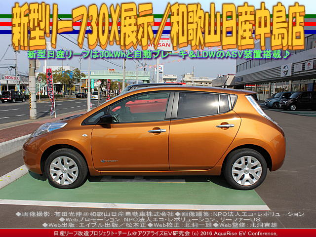 以上、新型リーフ30X展示/和歌山日産中島店の各画像はクリックで全て640x480pxlsに拡大します。 ※本ブログページのすべての画像3枚をスライドショー440x330pxlsで見られます。 ※本ブログ「新型リーフ30X展示/和歌山日産中島店」5作シリーズのすべての画像15枚のスライドショーはこちらから見られます。 | ||||