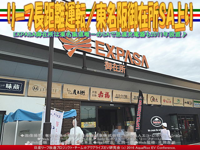 和歌山日産本社中島店の有田課長さん愛車の法定順守のドレスアップ日産リーフ改造カスタムコンプリートカー<MARIDA>号(5年リーフで走行距離も6万Km越えのリチウムバッテリーメーターレベル11/12で少々劣化中)で「日産リーフで行く長距離ドライブ~598.32km東京台場ガンダムへの旅」でも走っています。今回もわが愛車<ラプソディア>号で東京へ向かっています。名塩SA(参照『名塩SA上り』『西宮名塩SA下り』)、桂川PA(参照『桂川PA上り』*『桂川PA下り』)を経て、草津(参照*『草津PA上り』『草津PA下り』)で名神から分かれて、新名神に入ったのもつかの間。今度は東名阪自動車道に入ります。御在所SAは三重県四日市市にあります。 【リーフ長距離運転/東名阪御在所SA上り 01】 御在所というと、御在所岳。むかし、この山越えで桑名に来たことがあります。そんな険しい山を想像するので、きっと山中のひなびたSAに違いないと思っていたら、なんと平地にありました。この日は天気が悪いので見えませんでしたが、ふだんはきっと北の方はるかに、御在所岳を仰ぐことができるのでしょう。 【リーフ長距離運転/東名阪御在所SA上り 02】 今回は、東名阪自動車道のEXPASA御在所(上り:名古屋方面)で急速充電スポットを利用しながら少し私も休息充電します。東名阪自動車道をWikipediaで調べると、<東名阪自動車道(ひがしめいはんじどうしゃどう、HIGASHI-MEIHAN EXPRESSWAY)は、愛知県名古屋市中川区の名古屋西JCTから三重県津市の伊勢関ICへ至る高速道路(高速自動車国道)である。略称は東名阪道(ひがしめいはんどう、HIGASHI-MEIHAN EXPWY)、東名阪(ひがしめいはん)など。法定路線名では東名阪自動車道全線が近畿自動車道名古屋亀山線の一部に含まれる。>とあります。 【リーフ長距離運転/東名阪御在所SA上り 03】 この御在所SA(ございしょサービスエリア)は、三重県四日市市の東名阪自動車道上にある東名阪道唯一のサービスエリアです。2010年(平成22年)9月17日にリニューアル工事が完成し、「EXPASA御在所(エクスパーサ御在所)」の愛称がつけられています。そして、2010年12月に日産リーフが発売。翌年2011年(平成23年)に御在所SA上り下り線にEV電気自動車用急速充電器が設置され、役立つEV電気自動車急速充電スポットとしてデビューしています。 【リーフ長距離運転/東名阪御在所SA上り 04】 東名阪自動車道EXPASA御在所(上り:名古屋方面)をNEXCO中日本(中日本高速道路株式会社)で調べると、 ■住所: 〒512-0906 三重県四日市市 山之一色町字池之谷口156-9-2 ■駐車場: 大型:41/小型:290 ■トイレ: 男大:12/男小:26/女:72 ■バリアフリー: 駐車スペース大型1台/駐車スペース小型:3台/トイレ:2箇所 ■各種施設・サービス案内: エリア・コンシェルジュ、給油についてのお知らせ、ぷらっとパーク、無線LAN、ベビー&キッズ、ドッグラン、 バリアフリー、メディカルサービス、トイレ、スマートIC、ハイウェイオアシス、EV急速充電スタンド、バイキング・ドリンクバー、遊具設備 、宿泊施設&入浴施設、ハイウェイスタンプ、サービスエリアガイドなど。 ■電話: 059-332-0423 ■公式ページ:こちらから見れます。 ここ東名阪(東名阪自動車道)御在所SA上りの急速充電スポットは・・・続く ・・・次回の『リーフ急速充電御在所SA上り/リーフ改造』につづく ちなみに、日産リーフで行く長距離ドライブ・長距離運転のブログは、最近は「急速充電」ブログと重なっています。長距離を走るとどうしても急速充電スポットが不可欠です。長距離ドライブ・長距離運転=急速充電ブログは膨大な数に及んでいますので、間引きして以下にリストします。 『リーフ急速充電伊賀SA上り/リーフ改造』 『リーフ長距離運転/名阪国道伊賀SA上り』 『日産リーフ長距離ドライブ(東京)/リーフ改造』 『リーフ長距離運転・東京/日産リーフ改造』 『リーフ急速充電/京都日産桂店』 『京都日産桂店で急速充電/リーフ改造』 『リーフ急速充電(2)/イオンモール和歌山』 『リーフ急速充電/イオンモール和歌山』 『リーフ急速充電/和歌山日産狐島店』 『リーフ急速充電/兵庫日産鈴蘭台北店』 『リーフ急速充電/奈良県庁本庁舎』 『リーフ急速充電/奈良道の駅針テラス』 『リーフ急速充電/兵庫三菱自動車北神三田店』 『リーフ急速充電/三菱自動車ディーラー店』 『リーフ急速充電/兵庫日産三田東店』 『リーフ急速充電/日産大阪川口店』 『リーフ急速充電/兵庫日産高砂竜山店』 『リーフ急速充電/兵庫日産高砂中島店』 『リーフ急速充電/兵庫日産三木東店』 『リーフ急速充電/兵庫日産三木店』 『リーフ急速充電/イオンモール神戸北(2)』 『リーフ急速充電/イオンモール神戸北』 『リーフ急速充電/神戸エコール・リラ』 『リーフ急速充電/ダイエー藤原台店』 『リーフ急速充電/舞鶴若狭自動車道西紀SA』 『リーフ急速充電/(2)蒜山高原風の家』 『リーフ急速充電/蒜山高原道の駅風の家』 『リーフ急速充電/米子自動車道蒜山高原SA下り』 『リーフ急速充電/中国自動車道勝央SA下り』 『リーフ急速充電/