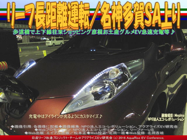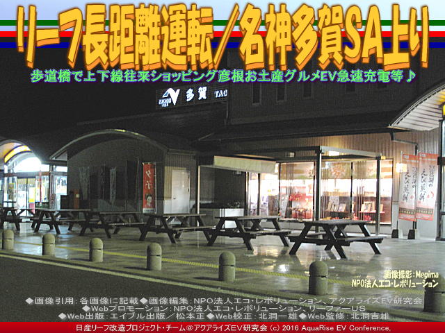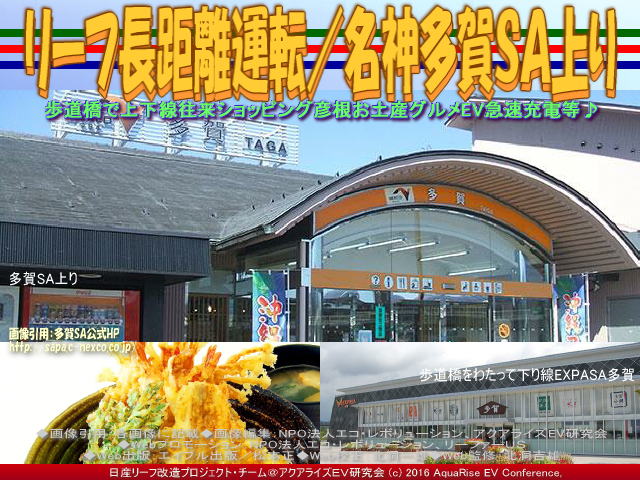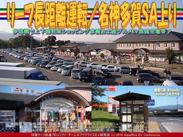先日より、2014年10月19日から10月22日の4日間に決行した「リーフで長距離運転・信州の旅」を御案内しています。私Megimaは、世界で一番売れているEV電気自動車日産リーフ(ルノー・日産アライアンス 累計25万台の電気自動車を販売)をいじってドレスアップ日産リーフ改造カスタムコンプリートカー<ラプソディア号>に乗っています。 【リーフ長距離運転/名神多賀SA上り 01】  リーフ長距離運転/名神多賀SA上り画像01 歩道橋で上下線往来ショッピング彦根お土産グルメEV急速充電等♪ この私の愛車赤いEV電気自動車で信州茅野の「蓼科高原チェルトの森」と「蓼科高原三井の森」の別荘を訪ねる旅を企画した時の記録が少しバラバラになっていたので、ライターHIROに手伝ってもらって整理・手直しして古いデータを更新しています。題して『ドレスアップ日産リーフ改造カスタムカー<ラプソディア号>で行く長野八ヶ岳の別荘地蓼科高原チェルトの森と三井の森393.48km - 約5時間28分』です。 【リーフ長距離運転/名神多賀SA上り 02】  リーフ長距離運転/名神多賀SA上り画像02 歩道橋で上下線往来ショッピング彦根お土産グルメEV急速充電等♪ 先日紹介した長距離運転・信州の旅の行程では、「N-Link OWNERS(エヌリンク・オーナーズ)」のルート検索で得た行程の中で、急速充電スポットについては、名神高速の草津PA(上り)→名神高速の充電スポット養老SA(上り)→中央道の充電スポット恵那峡SA(上り)→中央道の充電スポット駒ヶ岳SA(上り)の4箇所で急速充電停車して、目的地の長野県茅野市豊平への到着の所要時間は約4時間57分、走行距離は約396 kmの予定でした。でも実際に走り始めて、高速道路で利用した急速充電スポットは、名神高速道路草津PA上り→名神高速道路多賀SA上り→名神高速道路尾張一宮PA上り→中央自動車道恵那峡SA上り→中央自動車道駒ヶ岳SA上りの順、合計5か所を利用しました。 【リーフ長距離運転/名神多賀SA上り 03】  リーフ長距離運転/名神多賀SA上り画像03 歩道橋で上下線往来ショッピング彦根お土産グルメEV急速充電等♪ さて、2回目の長距離運転・急速充電スポットは、当初の計画とは異なる、名神高速道路多賀SA上りです。午前4時40分に到着。 名神高速道路多賀SA上りをネットで調べると、 【名神高速道路多賀SA上り】 ■名称: 多賀SA上り(たがサービスエリアのぼり) ■住所: 〒522-0342 滋賀県犬上郡多賀町敏満寺59-2 ■所属路線:名神高速道路 ■座標: 北緯35度13分、東経136度17分 ■駐車場: 大型:132台/小型:135台 ※sapa.c-nexco.co.jp参照 ■トイレ: 男大:8/男小:25/女:40 ■バリアフリー: 駐車スペース大型:1/駐車スペース小型:2/トイレ:2箇所 ■各種施設・サービス案内: エリア・コンシェルジュ、ぷらっとパーク、ドッグラン、レストラン、フードコート、自動販売機、ショッピングコーナー、宝くじ類、ベビーコーナー、AED、無線LAN、郵便ポスト、EV急速充電スタンド、ENEOSエネオス(JX日鉱日石エネルギー)など。詳しくはこちらの公式HPページから。 ■電話:0749-48-0422(エリア・コンシェルジュ) ■運営会社: 中日本高速道路(株) NEXCO中日本 ■公式ページ:こちらから見れます。 ※各データは2016年2月に調査したものです。データが古い場合や間違っている場合がありますので、詳しくはネットまたは関係各所でお調べくださいませ。 【リーフ長距離運転/名神多賀SA上り 04】  リーフ長距離運転/名神多賀SA上り画像04 歩道橋で上下線往来ショッピング彦根お土産グルメEV急速充電等♪ 目的地に急がない、慌てない・・・旅の途中の会話やハプニングを愛車リーフと皆でともに楽しみながら、のんびりゆったりスローライフで松本と茅野蓼科高原チェルトの森と三井の森を目指します。 さて、次の長距離運転・急速充電スポットはどこに?・・・「名神高速道路尾張一宮PA上り」です。 ちなみに、日産リーフで行く長距離ドライブ・長距離運転のブログは、最近は「急速充電」ブログと重なっています。長距離を走るとどうしても急速充電スポットが不可欠です。長距離ドライブ・長距離運転=急速充電ブログは膨大な数に及んでいますので、間引きして以下にリストします。 『リーフ長距離運転/名神多賀SA上り』 『リーフ急速充電草津PA上り/リーフ改造』 『リーフ長距離運転/名神草津PA上り』 『日産リーフ長距離ドライブ信州/リーフ改造』 『リーフ長距離運転・信州/日産リーフ改造』 『東京お台場ガンダム(3)/リーフ長距離運転』 『東京お台場ガンダム(2)/リーフ長距離運転』 『リーフ長距離運転/東京お台場ガンダム』 『リーフ急速充電海老名SA上り/リーフ改造』 『リーフ長距離運転/東名海老名SA上り』 『リーフ急速充電足柄SA上り/リーフ改造』 『リーフ長距離運転/東名足柄SA上り』 『リーフ急速充電駿河湾沼津SA上り/リーフ改造』 『リーフ長距離運転/駿河湾沼津SA上り』 『リーフ急速充電静岡SA上り/リーフ改造』 『リーフ長距離運転/新東名静岡SA上り』 『リーフ急速充電浜松SA上り/リーフ改造』 『リーフ長距離運転/新東名浜松SA上り