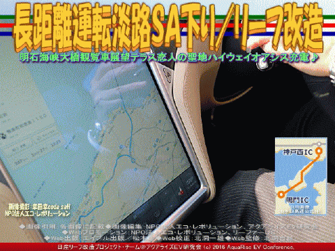 今回(今日)のブログ「神戸淡路鳴門道淡路SA下り/リーフ改造」は、EVテスラS(テスラ・モデルS)でAREVC泉北スタジオ(※参照『EVスタジオデッキ工事(4)/リーフ改造』『クーマのパネトーネ(3)/e-NV200のパン屋さん』)から徳島出張をした際に、途中EV電気自動車の急速充電インフラ事情で感じた事を記事に纏めました。 【長距離運転淡路SA下り/リーフ改造 01】  長距離運転淡路SA下り/リーフ改造画像01 明石海峡大橋観覧車展望テラス恋人の聖地ハイウェイオアシス充電♪ 今回の徳島出張でちょっと立ち寄った淡路SAをWikipedia「淡路SA」検索すると<淡路サービスエリア(あわじサービスエリア)は、兵庫県淡路市にある神戸淡路鳴門自動車道のサービスエリア (SA) である。淡路インターチェンジ (IC) に併設されている。本州四国連絡高速道路(JB本四高速)の休憩施設の中でも規模が最も大きく、総施設の売り上げは東名高速道路の海老名SAと並んで全国トップクラスである。また、2006年5月の連休前には下り線に観覧車が設置されるなど観光スポットとしても機能している。>とあります。 【長距離運転淡路SA下り/リーフ改造 02】  長距離運転淡路SA下り/リーフ改造画像02 明石海峡大橋観覧車展望テラス恋人の聖地ハイウェイオアシス充電♪ 今回(今日)のブログタイトルは「神戸淡路鳴門道淡路SA下り/リーフ改造」の「リーフ改造」となっていますが、実際私の愛車赤いEV電気自動車であるドレスアップ日産リーフ改造カスタムカー<ラプソディア号>に乗って立ち寄ったわけではありません。理由は途中急速充電インフラに不安があるからです。したがって今回は航続距離が500kmのテスラSでYamamotoA(※参照『エコなスーパーカーの条件(2)@リーフ改造』)が出張ります。このブログの執筆をしている私Megimaも淡路島や四国には所用で出かけることがあります。淡路島を縦断する神戸淡路鳴門道は約90キロメートル(正確には全長89.0km)。その間に急速充電を設置したSAPAはなかったと思います。確かに淡路SAでは、サービスエリア敷地内にはなくて淡路ハイウェイオアシス(公式ページ)まで行けばありますが・・・。 【長距離運転淡路SA下り/リーフ改造 03】  長距離運転淡路SA下り/リーフ改造画像03 明石海峡大橋観覧車展望テラス恋人の聖地ハイウェイオアシス充電♪ 神戸淡路鳴門自動車道の淡路島を縦断する道路上にはSAPA(サービスエリア・パーキングエリア)が4か所あります。南下順に淡路SA(あわじサービスエリア)、室津PA(むろづパーキングエリア)、緑PA(みどりパーキングエリア)、淡路島南PA(あわじしまみなみパーキングエリア)です。調べてみるとやっぱりこれらのSAPA敷地内には、残念ながら、2016年3月調査時点でEV電気自動車の急速充電スポットは一か所もありません。 【長距離運転淡路SA下り/リーフ改造 04】  長距離運転淡路SA下り/リーフ改造画像04 明石海峡大橋観覧車展望テラス恋人の聖地ハイウェイオアシス充電♪ でも、急速充電インフラが不十分な、この神戸淡路鳴門自動車道淡路SA下りはイケてます♪・・・次回の『神戸淡路鳴門道淡路SA下り/リーフ改造』につづく ちなみに、日産リーフで行く長距離ドライブ・長距離運転のブログは、最近は「急速充電」ブログと重なっています。長距離を走るとどうしても急速充電スポットが不可欠です。長距離ドライブ・長距離運転=急速充電ブログは膨大な数に及んでいますので、間引きして以下にリストします。 『長距離運転淡路SA下り/リーフ改造』 『リーフカスタム急速充電/松本日産茅野店』 『松本日産茅野店で急速充電/リーフ改造』 『リーフ長距離運転/松本日産茅野店』 『リーフ長距離運転/諏訪湖SAから茅野へ』 『リーフ急速充電諏訪湖SA上り/リーフ改造』 『リーフ長距離運転/中央道諏訪湖SA上り』 『松本日産松本から諏訪湖SAへ(3)/リーフ改造』 『松本日産松本から諏訪湖SAへ(2)/リーフ改造』 『松本日産松本から諏訪湖SAへ/リーフ改造』 『リーフ長距離運転/信州松本・安曇野』 『リーフ長距離運転/信州松本四方の山々』 『リーフカスタム急速充電/松本日産松本店』 『松本日産松本店で急速充電/リーフ改造』 『リーフ急速充電駒ヶ岳SA上り/リーフ改造』 『リーフ長距離運転/中央道駒ヶ岳SA上り』 『リーフ急速充電恵那峡SA上り/リーフ改造』 『リーフ長距離運転/中央道恵那峡SA上り』 『リーフ急速充電尾張一宮PA上り/リーフ改造』 『リーフ長距離運転/名神尾張一宮PA上り』 『リーフ急速充電多賀SA上り/リーフ改造』 『リーフ長距離運転/名神多賀SA上り』 『リーフ急速充電草津PA上り/リーフ改造』 『リーフ長距離運転/名神草津PA上り』 『日産リーフ長距離ドライブ信州/リーフ改造』 『リーフ長距離運転・信州/日産リーフ改造』 『東京お台場ガンダム(3)/リーフ長距離運転』 『東京お台場ガンダム(2)/リーフ長距離運転』 『リーフ長距離運転/東京お台場ガンダム』 『リーフ急速充電海老名SA上り/リーフ改造』 『リーフ長距離運転/東名海老名SA上り』 『リーフ急速充電足柄SA上り/リーフ改造』 