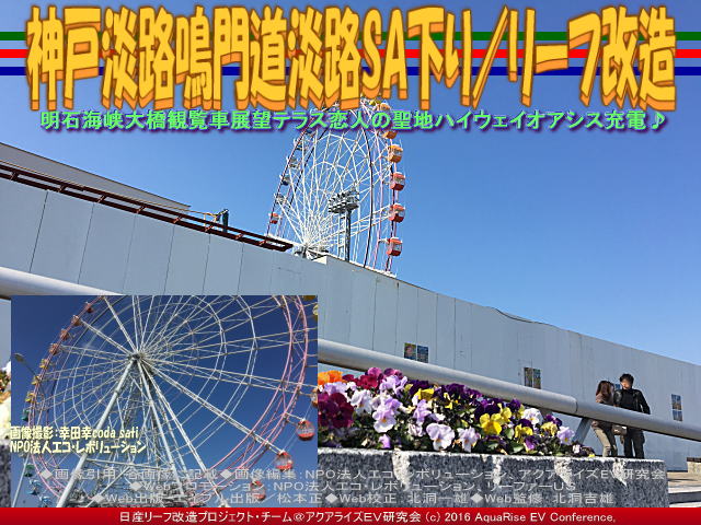 ・・・前回の『長距離運転淡路SA下り/リーフ改造』の続きは以下です。 でも、急速充電インフラが不十分な、この神戸淡路鳴門自動車道淡路SA下りはビジュアル的にアミューズメント的に見てイケてます♪Wikipediaから得た情報では、淡路島SAの総施設の売り上げは、東名高速道路のあの有名な海老名SA(※参照『リーフ長距離運転/東名海老名SA上り』『リーフ急速充電海老名SA上り/リーフ改造』)と並んで全国トップクラス。東京お台場ガンダムの旅で立ち寄った海老名SAにはEV電気自動車用急速充電器が2基ありました。でもこの淡路SA下りの敷地内にはEV電気自動車用急速充電器スポットや普通充電スタンドがないのが残念です。 【神戸淡路鳴門道淡路SA下り/リーフ改造 01】  神戸淡路鳴門道淡路SA下り/リーフ改造画像01 明石海峡大橋観覧車展望テラス恋人の聖地ハイウェイオアシス充電♪ すこし気になったのが、実際に神戸淡路鳴門道淡路SA下りから連絡道を通って渡れる淡路SA上りにあるハイウェイオアシスには急速充電スポットが設置されているのに、淡路SA下り敷地内にある「下りSA⇔ハイウェイオアシス⇔上りSAを自由に行き来できる」淡路ハイウェイオアシスへの案内版には、2016年3月の時点では、画像02でお分かりのように、あの青い急速充電スタンド表示が見つからなかったことです。ひょっとして私が見つけられなかったのかもしれませんが・・・。 【神戸淡路鳴門道淡路SA下り/リーフ改造 02】  神戸淡路鳴門道淡路SA下り/リーフ改造画像02 明石海峡大橋観覧車展望テラス恋人の聖地ハイウェイオアシス充電♪ 【神戸淡路鳴門自動車道淡路SA下り】 ■名称: 淡路SA下り(あわじサービスエリアくだり) ■住所: 〒656-2401 兵庫県淡路市岩屋2568 ■所属路線: 神戸淡路鳴門自動車道 ■座標: 北緯34度34分、東経135度0分 ■駐車場: 大型:102台/小型:330台 ※jb-highway.co.jp参照 ■トイレ: 男大:15/男小:31/女:62 ■バリアフリー: 駐車スペース大型:3/駐車場小型:4/トイレ:4箇所 ■各種施設: インフォメーション、レストラン、フードコート、売店、自動販売機、トイレ、身体障がい者用トイレ、ガソリンスタンド(太陽石油)、情報パネル、休憩所、ATMキャッシュサービス、望遠鏡、ベビーベッドコーナー・授乳室、FAX・コピーサービス、郵便ポスト、車イス施設内無料サービス、AED(自動体外式除細動器)、ドッグラン、携帯電話無料充電、ETC利用履歴発行プリンター、公衆無線LAN、大観覧車、スターバックスコーヒー、EV急速充電は淡路ハイウェイオアシス公式ページ、淡路SA大観覧車、淡路ハイウェイオアシスなど。2016年3月時点でコンビニなし。※詳しくはこちらの公式HPページから。 ■店舗: 詳しくはこちらの公式HPページ<グルメ><お土産> ■電話: 0799-72-4715(インフォメーション) ■運営会社: 本州四国連絡高速道路株式会社/本四高速 ■公式ページ: こちらから見れます。 ※各データは2016年3月に調査したものです。データが古い場合や間違っている場合がありますので、詳しくはネットまたは関係各所でお調べくださいませ。 【神戸淡路鳴門道淡路SA下り/リーフ改造 03】  神戸淡路鳴門道淡路SA下り/リーフ改造画像03 明石海峡大橋観覧車展望テラス恋人の聖地ハイウェイオアシス充電♪ この神戸淡路鳴門自動車道淡路SA下りは、全国で観覧車が存在する唯一のサービスエリアです。1人600円で乗って1周約12分の迫力満点の大観覧車がサイコーです。今回の徳島への所用が、お仕事でなかったら、日産e-NV200(※『日産e-NV200は世界初の電気ミニバン』『夢の日産EVバン改造/e-NV200』『e-NV200展示(2)/和歌山日産狐島店』『赤い日産e-NV200(3)/リーフ改造研』)でこの淡路SA下りにやってきて、この晴天の中観覧車に乗って、淡路名物美味しい玉ねぎの入った有名ハンバーガーを頬張って国営明石海峡公園をゆったり散歩して、うずしお科学館を見学して、鳴門の渦潮まで足を伸ばして、疲れたら淡路夢舞台にあるウェスティンホテル淡路のデラックスハリウッドツインで2泊ぐらいしたいなあ~と思いました。 【神戸淡路鳴門道淡路SA下り/リーフ改造 04】  神戸淡路鳴門道淡路SA下り/リーフ改造画像04 明石海峡大橋観覧車展望テラス恋人の聖地ハイウェイオアシス充電♪ あ、ところで、1周約12分1人600円の大観覧車にタイムサービスとか何回乗っても1500円とかの割引サービスがあればいいのになあ~。←だめ!観覧車はめちゃ資本がかかっているのだからそんな無理言っちゃダメだよ!スミマセン。(本段落HIRO文責) ちなみに、日産リーフで行く長距離ドライブ・長距離運転のブログは、最近は「急速充電」ブログと重なっています。長距離を走るとどうしても急速充電スポットが不可欠です。長距離ドライブ・長距離運転=急速充電ブログは膨大な数に及んでいますので、間引きして以下にリストします。 『神戸淡路鳴門道淡路SA下り/リーフ改造』 『長距離運転淡路SA下り/リーフ改造』 『リーフカスタム急速充電/松本日産茅野店』 『松本日産茅野店で急速充電/リーフ改造』 『リ