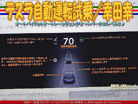 今回のバージョン7.1ソフトウエアのアップデート(『テスラS7.1アップデート(3)/自動駐車』『テスラS7.1アップデート(2)/車線変更』『テスラS7.1アップデート/自動運転』)は正式に国土交通省の承認を受けたことにより実際に自動運転走行を実現しています。日本では日産自動車はじめ主要なメーカーは自動運転技術を既に開発していて高速道路を含めた公道を走行できるレベルにありますが、実際には国土交通省からの認可は下りていません。米国のテスラモーターズは、根気強く日本の国土交通省と交渉を続ける中で、自動運転中の責任はドライバーが負うという自己責任の姿勢を明確にしたアメリカン・ディシプリンが功を奏して国交相の承認を受けたと言われています。 【テスラ自動運転試乗(2)/幸田幸 01】 米国のテスラモーターズは、世界の有名メーカーと競い合って折角開発成功してレベル2でも安全走行を現実的なものとしているのに、その国の法律・条例や認可の問題で実際に高速道路と自動車専用道路での走行可能に至らない現状に甘んじないで、大方の予想を裏切って日本の国交省で自動運転の承認を取りつけたことは流石です。アメリカ合衆国建国以来アメリカ国民と米国企業に流れるフロンティア・スピリットとセルフ・レスポンシビリティ=セルフ・リスポンシビリティ(開拓精神と自己責任)の熱い血の賜です。 【テスラ自動運転試乗(2)/幸田幸 02】 実際、米国のテスラモーターズのテスラS(ModelS/モデルS)の自動運転が日本で可能になった経緯には、アメリカだからこそなしえた技と背景があるのかも知れないです。過去ハーレー・ダビッドソンが、国交省に規制緩和を訴えて、2005年から高速道路での2輪車2人乗りが認可されたのは記憶に新しいです。穿った考え方かも知れませんが、所謂1853年浦賀ペリーの黒船来航のようなエクスターナル・プレッシャーのように思えてなりません。でも外圧でも日本の市場がEV電気自動車の自動運転化によって活気づくことは刺激的で良いことです。 【テスラ自動運転試乗(2)/幸田幸 03】 今回2016年3月2日(水)に四国徳島出張の際に、バージョン7.1がインストールアップデートされたテスラS(ModelS/モデルS)で自動運転を試乗試用します。私、幸田幸(こうださち)も試乗させて頂きます。テスラSの自動運転車試乗は、初めての経験なのでドキドキわくわく♪自動運転の詳細は、テスラS(テスラモデルS)搭載の液状パネルの、オーナーズマニュアルの「自動運転」欄に取説があります。 【テスラ自動運転試乗(2)/幸田幸 04】 簡略すれば、高速道路か自動車道で、 ▼先に液状パネル「自動運転」欄で「自動」をONにしておく。 ▼同様に、「自動車線変更」欄で「自動」をONにしておく。 ▼時速30㎞以上で走行しており、前方に走行車両あれば、ハンドル(ステアリング)左奥の下の方のレバーを速めに2回手前に引く。 ▼これで自動運転の開始。 ▼インパネ上の小さな丸印がグレーからブルーに変われば自動運転のこと。ただし、自動運転中は、ドライバーの手がハンドル(ステアリング)に常に触れておかねばならない規則となっている。 ▼自動運転をキャンセルするには、ハンドル(ステアリング)を少しでも動かすかブレーキを踏む。 以上のように、私幸田幸(こうださち)にもできる簡単操作、言ってみれば「サルでもできる自動運転」です。 因みに、米国を代表するEV電気自動車テスラモデルS(テスラS)についての記事は、今までに、 【テスラ自動運転7.1アップデート】シリーズとして、 『テスラS7.1アップデート(3)/自動駐車』 『テスラS7.1アップデート(2)/車線変更』 『テスラS7.1アップデート/自動運転』 【テスラロードスター】ブログシリーズとして、 『テスラロードスター(5)/テスラ心斎橋』 『テスラロードスター(4)/テスラ心斎橋』 『テスラロードスター(3)/テスラ心斎橋』 『テスラロードスター(2)/テスラ心斎橋』 『テスラロードスター/テスラ心斎橋』 2015年9月テスラ心斎橋のオープン一か月後の紹介ブログ 『テスラ心斎橋(3)/NPOエコ・レボリューション』 『テスラ心斎橋(2)/NPOエコ・レボリューション』 『テスラ心斎橋/NPOエコ・レボリューション』 2015年8月4日(火)テスラ大阪心斎橋オープン当日の紹介ブログ 『テスラ大阪心斎橋オープン(3)/EV研』 『テスラ大阪心斎橋オープン(2)/EV研』 『テスラ大阪心斎橋オープン/EV研』 【テスラマン】シリーズとして、 『テスラ特約店ビーライト(3)/リーフEV研』 『テスラ特約店ビーライト(2)/リーフEV研』 『テスラ特約店ビーライト/リーフEV研』 【テスラ・アップデート】シリーズとして、 『テスラ6.2アップデート(2)/リーフEV研』 『テスラ6.2アップデート/リーフEV研』 『テスラソフトウエア6.1更新/リーフEV研』 【テスラ充電】シリーズとして、 『テスラ急速充電/EVテスラ研究会』 『テスラ急速充電(2)/日産和泉中央』 『テスラ急速充電/日産和泉中央』 『テスラ200V充電器/EV研究会』 『リーフ200Vテスラ充電/EV研究会』 【テスラ試乗会】シリーズとし