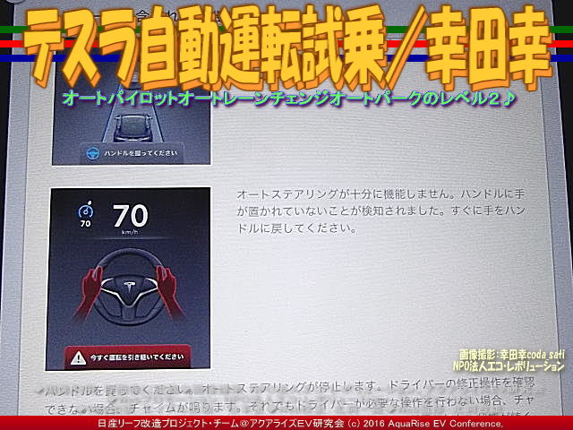 私、幸田幸(こうださち※参照『映画の森てんこ森』)はテスラSのオーナーズマニュアルの「自動運転」欄はしっかり読みましたが、実際に自動運転走行してみないと分かりません。テスラS(ModelS/モデルS)の自動運転を体感認識するには、道幅が十分で交通量が少なくて安全な高速道路か自動車道が必要です。そこで今回は四国・徳島出張に同行。阪神高速4号湾岸線と阪神高速5号湾岸線や第二神明は我慢のパス。最初にウチの山本理事長さんに試してもらってから、私も神戸淡路鳴門自動車道の室津PA下りから、高松自動車道、徳島自動車道で試すことにしました。 【テスラ自動運転試乗(3)/幸田幸 01】 以上のオーナーズマニュアルの「自動運転」欄は読みましたけど、実際に自動走行して気付いて処置した点が以下です。 ▼前方車両との車間距離は、クルーズコントロール(ハンドル左奥の下の方のレバー)の車間距離で調節できる。 1~7まである中で、自分の気に入った車間距離で自動運転できる。 ▼今回は、自動運転して車間距離が短いと気付いたので、次にPAで停車した際に調整した。1だったので7に変えた。これで心地よくなった。 ▼前方に走行車両がいなくても自動運転を始められた。 ▼両手をハンドルから離しても自動運転走行が可能だと動画でも紹介されているが、日本では交通違反行為だし、もし万が一のことがあると怖いので実行しなかった。 ▼自動運転の最高速度は、その道路の法定速度を基準に変更できる。 ▼液状パネル「自動運転」欄で「-0+」欄を、法定速度が希望なら0のままでもいいし、少しスピードを上げたいなら「+」をタップしていって好みの速度に上げる。例えば、時速80㎞の道なら、「+」をタップして95㎞とか、時速100㎞の道なら、「+」をタップして110㎞とか。 実際、時速100㎞の道を110㎞にして走行したらどうかなと思ったけど、スピード違反になるし初めての経験で怖いので実行しなかった。 ▼最高速度100キロメートルの区間では、カーブでも何でもちゃんと100㎞で自動運転走行してくれる。 ▼きついカーブで遠心力が凄すぎて怖ければ、ハンドル(ステアリング)を少しでも弄れば手動走行になれる。 【テスラ自動運転試乗(3)/幸田幸 02】 当NPO法人エコ・エコレボリューションの山本理事長さんが淡路SA下りから室津PA下りまで自動運転の見本を見せてくれました。私の自動運転は、神戸淡路鳴門自動車道の室津PA下りから徳島自動車道の上板SA下りまでの高速道路上です。簡単明快にいえば、テスラの自動運転は感動でした。とっても運転が楽チンでした。アクセルも操作せずただハンドル(ステアリング)を軽く握っているだけで、ちゃんとレーンの真ん中を走ってくれます。ただ座っているだけ。因みに最高速度100km/hで走れる区間は、神戸淡路鳴門自動車道の神戸西ICから垂水JCT・ICの区間、そして淡路ICから西淡三原ICまでの区間です。その他は時速80キロメートルです。 【テスラ自動運転試乗(3)/幸田幸 03】 ほんと、自動運転モードにしていると、運転している感覚は薄れます。日頃リーフ改造カスタム(『カスタムカーLEAF/日産大阪岸和田南』『カスタマイズLEAF/日産リーフ改造』『リーフカスタムカー赤白黄色(3)/リーフ改造』『リーフ電動サンルーフ(4)/リーフカスタム』)で80キロで高速道路を走っているときは、あまり周りの景色など見る余裕がありません。しかし、このテスラS(ModelS/モデルS)の自動運転中はいろいろと眼に入ってきて見えてきます。自動運転モードにするとインパネ上の中央が走行している道路の絵になっていて、自車と前方の車と抜いていく車両まで車の絵で表示されています。乗用車か大型トラック或いはバスかの違いまで絵で示されていてテスラモーターズ社とテスラS(ModelS/モデルS)の開発者さんの拘りを感じて感激、とても面白いです。 【テスラ自動運転試乗(3)/幸田幸 04】 上の画像04は、神戸淡路鳴門自動車道の淡路ICから西淡三原ICまでの区間を自動運転で法定最高速度の時速100キロメートル走行した時のワンショットです。 因みに、米国を代表するEV電気自動車テスラモデルS(テスラS)についての記事は、今までに、 【テスラ自動運転7.1アップデート】シリーズとして、 『テスラS7.1アップデート(3)/自動駐車』 『テスラS7.1アップデート(2)/車線変更』 『テスラS7.1アップデート/自動運転』 【テスラロードスター】ブログシリーズとして、 『テスラロードスター(5)/テスラ心斎橋』 『テスラロードスター(4)/テスラ心斎橋』 『テスラロードスター(3)/テスラ心斎橋』 『テスラロードスター(2)/テスラ心斎橋』 『テスラロードスター/テスラ心斎橋』 2015年9月テスラ心斎橋のオープン一か月後の紹介ブログ 『テスラ心斎橋(3)/NPOエコ・レボリューション』 『テスラ心斎橋(2)/NPOエコ・レボリューション』 『テスラ心斎橋/NPOエコ・レボリューション』 2015年8月4日(火)テスラ大阪心斎橋オープン当日の紹介ブログ 『テスラ大阪心斎橋オープン(3)/EV研』 『テスラ大阪心斎橋オープ