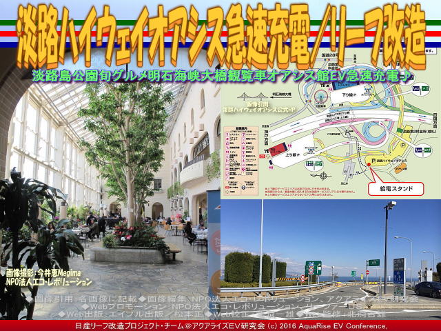 翌日2016年3月14日(月)の私のブログやfacebookに<淡路島に行きました。明石海峡大橋を渡ってすぐに、淡路SAがあります。淡路インターも同じところです。普通は、ただそれだけだと思うでしょうけれど、さらに淡路ハイウェイオアシスという、立派な施設がつながっているのです。あらかじめ地図や観光案内で予備知識を仕入れておかないと、気づかずに通り過ぎてしまいます。>と書き込みました。 【淡路ハイウェイオアシス急速充電/リーフ改造 01】  淡路ハイウェイオアシス急速充電/リーフ改造画像01 淡路島公園旬グルメ明石海峡大橋観覧車オアシス館EV急速充電♪ ここをクリックで1280x960に拡大 さらに<明石海峡大橋を一望できる、見晴らしのいい高台に、それはあります。広い敷地の兵庫県立淡路島公園と一体になっていて、その気であれば、一日ゆっくりと過ごすこともできます。この日は少し寒いけれど、久しぶりに晴天に恵まれました。>と続けました。 【淡路ハイウェイオアシス急速充電/リーフ改造 02】  淡路ハイウェイオアシス急速充電/リーフ改造画像02 淡路島公園旬グルメ明石海峡大橋観覧車オアシス館EV急速充電♪ 正直、手前味噌かも知れませんが、見渡すと、淡路ハイウェイオアシスで急速充電をしている<ラプソディア号>の姿が、ハイウェイオアシスの南欧風の瀟洒な建物と広々とした駐車場をバックに、観覧車がランドマークの淡路SAと明石海峡大橋(パールブリッジ)と青い空と白い雲と広い海、緑と綺麗なカラーリングの花々とのシチュエーションの中でとても立派で輝いて見えました。こんな綺麗な景色と大気はCO2排出ガス等の汚染物質で汚してはいけないなあ~とつくづく思います。 【淡路ハイウェイオアシス急速充電/リーフ改造 03】  淡路ハイウェイオアシス急速充電/リーフ改造画像03 淡路島公園旬グルメ明石海峡大橋観覧車オアシス館EV急速充電♪ さて、淡路ハイウェイオアシスに設置されている急速充電器は日産製急速充電器です。いつも私たちリーファー(リーフ乗り)がよくお世話になっている日産のお店(※参照『リーフ急速充電/京都日産桂店』『リーフ急速充電/和歌山日産狐島店』『リーフ急速充電/兵庫日産鈴蘭台北店』『リーフ急速充電/兵庫日産三田東店』『リーフ急速充電/日産大阪川口店』『リーフ急速充電/兵庫日産高砂竜山店』『リーフ急速充電/兵庫日産高砂中島店』『リーフ急速充電/兵庫日産三木東店』『リーフ急速充電/兵庫日産三木店』『リーフ急速充電/日産大阪豊中北』『リーフ急速充電/日産大阪川西@リーフカスタム』『リーフ急速充電/日産河内長野南@リーフカスタム』『リーフ急速充電/日産大阪泉北@リーフカスタム』『リーフ急速充電/日産大阪鳳南(2)@リーフカスタム』『リーフ急速充電/日産大阪高石@リーフカスタム』『リーフ急速充電/日産岸和田南』『リーフ急速充電/日産大阪堺店』等)に設置してある馴染みのある急速充電器です。 【淡路ハイウェイオアシス急速充電/リーフ改造 04】  淡路ハイウェイオアシス急速充電/リーフ改造画像04 淡路島公園旬グルメ明石海峡大橋観覧車オアシス館EV急速充電♪ 【淡路ハイウェイオアシスの急速充電案内】 ※2016年3月30日(水)調査 □運営会社: 本州四国連絡高速道路(株)、ユーアールエー(株)神戸淡路鳴門自動車道淡路ハイウェイオアシス □路線名: 神戸淡路鳴門自動車道(こうべあわじなるとじどうしゃどう) □PASA名: 淡路SA上り(あわじサービスエリアのぼり) □所在地: 〒656-2401 兵庫県淡路市岩屋大林2674-3 □充電タイプ: CHAdeMO 充電器タイプ 急速(50kW以下) □急速充電: 1台(CHAdeM対応) ケーブル付属 □充電器メーカー: 日産自動車 □ニチコン中速充電: なし □200V普通充電: なし □100V普通充電: なし □テスラ用高速充電: なし □料金: 充電毎課金 有料 □駐車料金: 無料 □営業時間: 年中無休、終日24h営業 □会員認証システム: JTB おでかけCard プレミアカード、日産ZESPスタンダードカード、三菱自動車電動車両サポート、急速・普通併用NCSカード □事前連絡: 不要 □連絡先電話番号:0799-72-0220(淡路ハイウェイオアシス上下共通) □設置場所: 淡路SA(上り・下り)から入場し、右側(大型車・身障者エリア)の奥 □充電時間: 1回30分まで □ビジター料金: 5分まで250円、以降1分あたり50円(税抜き) □JCN電話: 0570-200-588 ※各データは2016年3月調査したものです。データが古い場合や間違っている場合がありますので、詳しくはネットまたは関係各所でお調べくださいませ。 【淡路ハイウェイオアシス急速充電/リーフ改造 05】  淡路ハイウェイオアシス急速充電/リーフ改造画像05 淡路島公園旬グルメ明石海峡大橋観覧車オアシス館EV急速充電♪ ちなみに、日産リーフで行く長距離ドライブ・長距離運転のブログは、最近は「急速充電」ブログと重なっています。長距離を走るとどうしても急速充電スポットが不可欠です。長距離ドライブ・長距離運転=急速充電ブログは膨大な数に及んでいますので、間引きして以下にリストします。 『淡路SA下り急