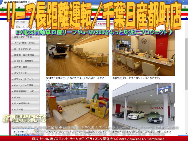 今回の紹介ブログは、『リーフ長距離運転/千葉日産都町店』です。 ※本ブログは、私たちボランティア団体である当アクアライズEV研究会(別名:「EVリーフ改造」や「リーフEV研」や「リーフ改造研」や「リーフ改造EV研」や「EV研究会」や「EV研」や「AREV神戸」)が中心となって作成。特定非営利活動促進法に基づき法人格を得た団体(特定非営利活動法人)NPO法人エコ・レボリューション(NPO法人エコ・レボリューションCOMまたはNPO法人エコ・レボリューションNET、そしてNPO法人エコ・レボリューションINFO)の傘下で活動しています。 ※NPO法人エコレボリューションは、今乗っているガソリン車をEV電気自動車に乗り換えて、規制対象の排出ガス汚染物質の削減=ゼロエミッション活動を通じて「ストップ・ザ・地球温暖化」に地域レベルで貢献することを旨として、現在「乗換えにはEV、今こそ決断♪」を推進しています。