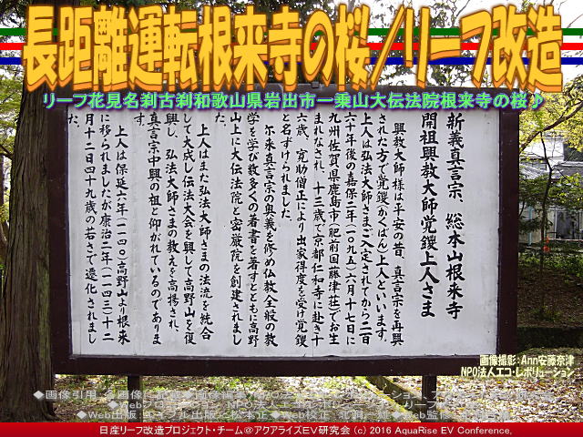 和歌山のリーファー(リーフ乗り)友達の案内で初めて根来寺=根來寺(ねごろじ)の7,000本の桜お花見に出かけました。綺麗だったです♪今年も桜見物ができて楽しかったです。ありがとうございます。和歌山の岩出市にある根来寺の桜はとても有名でお花見シーズン・桜開花情報が出される頃には花見客や観光客で一杯だそうです。私たちはドレスアップ日産リーフ改造・カスタムコンプリートカー(『リーフカスタム見て見て!/リーフ改造』『カスタムカーLEAF/日産大阪岸和田南』『カスタマイズLEAF/日産リーフ改造』『リーフカスタムカー赤白黄色(3)/リーフ改造』)のジオペット号に乗って出かけました。 【長距離運転根来寺の桜/リーフ改造 01】  長距離運転根来寺の桜/リーフ改造画像01 リーフ花見名刹古刹和歌山県岩出市一乗山大伝法院根來寺の桜♪ 根来寺パンフレットを見る 根来寺(根來寺)(ねごろじ)は、和歌山県岩出市にある新義真言宗総本山の寺院。山号を一乗山といいます。正確な名称は、一乗山大伝法院根来寺(いちじょうざんだいでんぽういんねごろじ)です。本尊は大日如来、開山は興教大師=覚鑁上人(かくばんしょうにん)です。以下は根来寺(根來寺)境内にあった案内版です。読みやすいようにテキストに起こしました。 【長距離運転根来寺の桜/リーフ改造 02】  長距離運転根来寺の桜/リーフ改造画像02 リーフ花見名刹古刹和歌山県岩出市一乗山大伝法院根來寺の桜♪ 新義真言宗、総本山根来寺 開祖興教大師覚鑁上人さま 興教大師様は平安の昔、真言宗を再興された方で覚鑁(かくばん)上人といいます。上人は弘法大師さまご入定されてから二百六十年後の嘉保二年(1095)六月十七日に九州佐賀県鹿島市(肥前国藤津荘)でお生まれなされ、十三歳で京都仁和寺に赴き十六歳、寛助僧正により出家得度を受け覚鑁と名ずけられました。 爾来真言宗の奥義を修め仏教全般の教学を学び数多くの著書を著すとともに高野山上に大伝法院と密厳院を創建されました。 上人はまた弘法大師さまの法流を統合して大成し伝法大会を興して高野山を復興し、弘法大師さまの教えを高揚され、真言宗中興の祖と仰がれているのであります。 上人は保延六年(1140)高野山より根来に移られましたが康治二年(1143)十二月十二日四十九歳の若さで遷化されました。 【長距離運転根来寺の桜/リーフ改造 03】  長距離運転根来寺の桜/リーフ改造画像03 リーフ花見名刹古刹和歌山県岩出市一乗山大伝法院根來寺の桜♪ さて、桜の開花情報は、2016年4月6日(水)は満開、そして翌日は大雨と春の嵐のような風が吹いて、翌4月8日(金)は駐車場や道路や境内には桜の花が散り落ちて淡いピンク色に染まりかけようとしていました。初めての根来寺=根來寺(ねごろじ)のお花見♪空は青くはなかったですが、まさに花曇り。趣があって綺麗だったです♪二日にわたって想像以上の桜見物ができて楽しかったです。 【長距離運転根来寺の桜/リーフ改造 04】  長距離運転根来寺の桜/リーフ改造画像04 リーフ花見名刹古刹和歌山県岩出市一乗山大伝法院根來寺の桜♪ 根来寺はお寺周辺は整備されていて、境内もごみ一つない綺麗なお寺です。そして桜の花咲く庭園は国から名勝として指定された日本庭園です。紀州徳川家から拝領の名草御殿(なぐさごてん)に面した江戸時代の庭園で、自然の滝と池を配した庭園です。とても貴重なものを拝見しました。ありがとうございます。この「長距離運転根来寺の桜/リーフ改造」では12枚画像を紹介しています。満開の日の桜と散りかけた桜の日の画像をアップしています。ご覧いただければ幸いです。 ちなみに、お仕事や余暇でEV電気自動車に乗って出かけた長距離運転・長距離ドライブや出先の急速充電スポットで取材できた事柄をブログに取り上げています。いつの間にか膨大な数に及んでいますので、間引きして以下にリストします。 『淡路ハイウェイオアシス急速充電/リーフ改造』 『リーフ長距離運転/淡路ハイウェイオアシス』 『淡路SA下り急速充電(3)/リーフ改造』 『淡路SA下り急速充電(2)/リーフ改造』 『淡路SA下り急速充電/リーフ改造』 『本四高速室津PA下り/テスラ自動運転』 『本四高速淡路SA下り/テスラ自動運転』 『神戸淡路鳴門道淡路SA下り/リーフ改造』 『長距離運転淡路SA下り/リーフ改造』 『リーフカスタム急速充電/松本日産茅野店』 『松本日産茅野店で急速充電/リーフ改造』 『リーフ長距離運転/松本日産茅野店』 『リーフ長距離運転/諏訪湖SAから茅野へ』 『リーフ急速充電諏訪湖SA上り/リーフ改造』 『リーフ長距離運転/中央道諏訪湖SA上り』 『松本日産松本から諏訪湖SAへ(3)/リーフ改造』 『松本日産松本から諏訪湖SAへ(2)/リーフ改造』 『松本日産松本から諏訪湖SAへ/リーフ改造』 『リーフ長距離運転/信州松本・安曇野』 『リーフ長距離運転/信州松本四方の山々』 『リーフカスタム急速充電/松本日産松本店』 『松本日産松本店で急速充電/リーフ改造』 『リーフ急速充電駒ヶ岳SA上り/リーフ改造