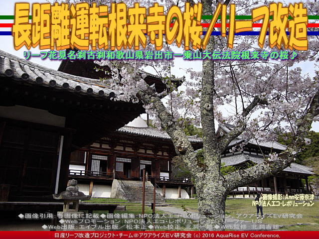 今回の紹介ブログは、『長距離運転根来寺の桜/リーフ改造』です。 「長距離運転根来寺の桜/リーフ改造」は3作シリーズ・トリオロジーでお届けします。 ※本ブログは、私たちボランティア団体である当アクアライズEV研究会(別名:「EVリーフ改造」や「リーフEV研」や「リーフ改造研」や「リーフ改造EV研」や「EV研究会」や「EV研」や「AREV神戸」)が中心となって作成。特定非営利活動促進法に基づき法人格を得た団体(特定非営利活動法人)NPO法人エコ・レボリューション(NPO法人エコ・レボリューションCOMまたはNPO法人エコ・レボリューションNET、そしてNPO法人エコ・レボリューションINFO)の傘下で活動しています。
