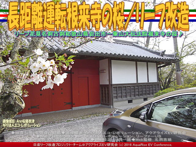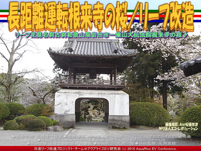 今回の紹介ブログは、『長距離運転根来寺の桜(3)/リーフ改造』です。 前回(昨日)のブログ『長距離運転根来寺の桜(2)/リーフ改造』の続きです。 前々回(一昨日)のブログ『長距離運転根来寺の桜/リーフ改造』から続いています。 画像タイトルは「長距離運転根来寺の桜/リーフ改造」で統一して、3作トリオロジーでお届けしています。今回で「長距離運転根来寺の桜」シリーズは終了です。 ※本ブログは、私たちボランティア団体である当アクアライズEV研究会(別名:「EVリーフ改造」や「リーフEV研」や「リーフ改造研」や「リーフ改造EV研」や「EV研究会」や「EV研」や「AREV神戸」)が中心となって作成。特定非営利活動促進法に基づき法人格を得た団体(特定非営利活動法人)NPO法人エコ・レボリューション(NPO法人エコ・レボリューションCOMまたはNPO法人エコ・レボリューションNET、そしてNPO法人エコ・レボリューションINFO)の傘下で活動しています。