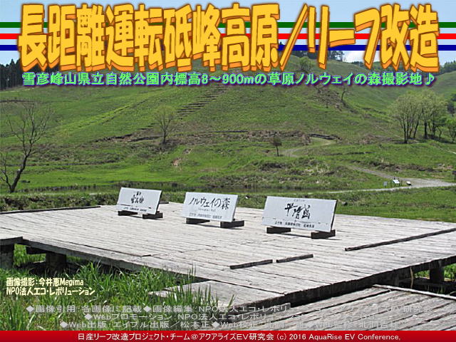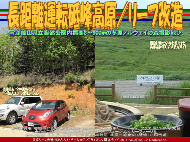 さて、今年は『砥峰高原にて』というタイトルで2016年05月18日カテゴリー=旅行として、私の別のブログや私のfacebookに投稿しています。引用すると<砥峰高原(とのみねこうげん)は、広く開けた明るい所でした。第二次世界大戦のころは、軍用馬の牧場になっていたのだそうです。いろんな映画やテレビドラマのロケ地としても知られています。「軍師官兵衛」「ノルウェイの森」「平清盛」などです。・・・以下省略>と書き込みました。 【長距離運転砥峰高原/リーフ改造 02】  長距離運転砥峰高原/リーフ改造画像02 雪彦峰山県立自然公園内標高8~900mの草原ノルウェイの森撮影地