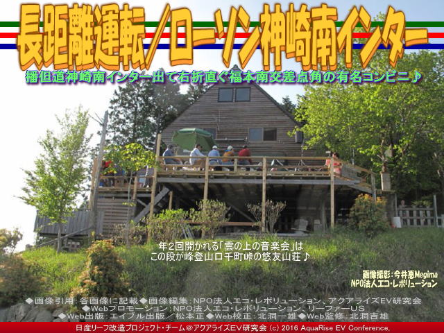 このローソン神崎南インター店は、愛車ドレスアップ日産リーフ改造カスタムカー「ラプソディア号」に乗って、先月2016年5月15日(日)~2016年5月16日(月)に開催された「第31回雲の上の音楽会in悠友山荘」へのリーフ長距離運転の途中に立ち寄りました。目的地の段が峰の登山口千町峠にある悠友山荘に行くには、電気が足りなくならないように、十分な備えが必要です。山道で立ち往生は、いやです。もちろんガソリン車でもそうですが。電気自動車の航続距離はまだ短いので、運行計画をきちんと立てなければいけません。 【長距離運転/ローソン神崎南インター 01】  長距離運転/ローソン神崎南インター画像01 播但道神崎南インター出て右折直ぐ福本南交差点角の有名コンビニ♪