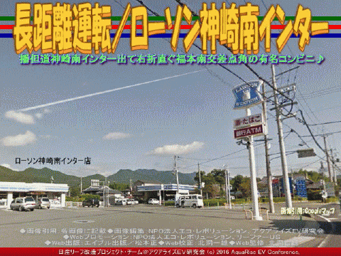 今回の紹介ブログは、『長距離運転/ローソン神崎南インター』です。 ※本ブログは、私たちボランティア団体である当アクアライズEV研究会(別名:「EVリーフ改造」や「リーフEV研」や「リーフ改造研」や「リーフ改造EV研」や「EV研究会」や「EV研」や「AREV神戸」)が中心となって作成。特定非営利活動促進法に基づき法人格を得た団体(特定非営利活動法人)NPO法人エコ・レボリューション(NPO法人エコ・レボリューションCOMまたはNPO法人エコ・レボリューションNET、そしてNPO法人エコ・レボリューションINFO)の傘下で活動しています。 ※NPO法人エコ・レボリューションは、今乗っているガソリン車をEV電気自動車に乗り換えて、規制対象の排出ガス汚染物質の削減=ゼロエミッション活動を通じて「ストップ・ザ・地球温暖化」に地域レベルで貢献することを旨として、現在「乗換えにはEV、今こそ決断♪」を推進しています。