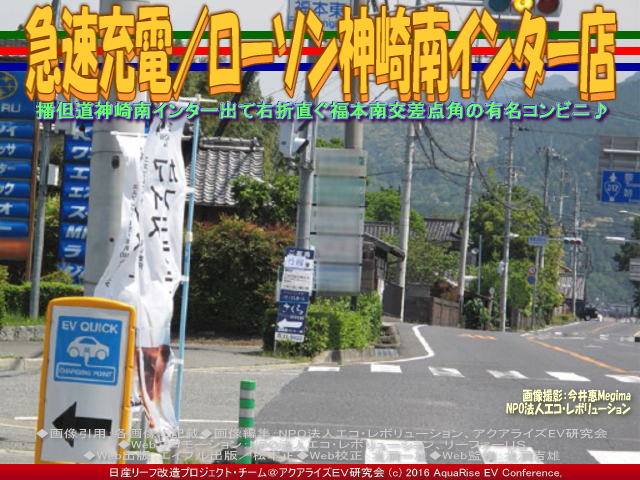 今回の紹介ブログは、『急速充電/ローソン神崎南インター店』です。 前回(昨日)のブログ『長距離運転/ローソン神崎南インター』の姉妹編です。 ※本ブログは、私たちボランティア団体である当アクアライズEV研究会(別名:「EVリーフ改造」や「リーフEV研」や「リーフ改造研」や「リーフ改造EV研」や「EV研究会」や「EV研」や「AREV神戸」)が中心となって作成。特定非営利活動促進法に基づき法人格を得た団体(特定非営利活動法人)NPO法人エコ・レボリューション(NPO法人エコ・レボリューションCOMまたはNPO法人エコ・レボリューションNET、そしてNPO法人エコ・レボリューションINFO)の傘下で活動しています。 ※NPO法人エコ・レボリューションは、今乗っているガソリン車をEV電気自動車に乗り換えて、規制対象の排出ガス汚染物質の削減=ゼロエミッション活動を通じて「ストップ・ザ・地球温暖化」に地域レベルで貢献することを旨として、現在「乗換えにはEV、今こそ決断♪」を推進しています。