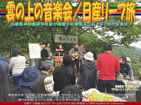 今回の紹介ブログは、『雲の上の音楽会/日産リーフ旅』です。 ※本ブログは、私たちボランティア団体である当アクアライズEV研究会(別名:「EVリーフ改造」や「リーフEV研」や「リーフ改造研」や「リーフ改造EV研」や「EV研究会」や「EV研」や「AREV神戸」)が中心となって作成。特定非営利活動促進法に基づき法人格を得た団体(特定非営利活動法人)NPO法人エコ・レボリューション(NPO法人エコ・レボリューションCOMまたはNPO法人エコ・レボリューションNET、そしてNPO法人エコ・レボリューションINFO)の傘下で活動しています。 ※NPO法人エコ・レボリューションは、今乗っているガソリン車をEV電気自動車に乗り換えて、規制対象の排出ガス汚染物質の削減=ゼロエミッション活動を通じて「ストップ・ザ・地球温暖化」に地域レベルで貢献することを旨として、現在「乗換えにはEV、今こそ決断♪」を推進しています。