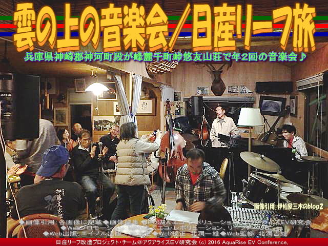 今回の紹介ブログは、『雲の上の音楽会(2)/日産リーフ旅』です。 前回(昨日)のブログ『雲の上の音楽会/日産リーフ旅』の続きです。 ※本ブログは、私たちボランティア団体である当アクアライズEV研究会(別名:「EVリーフ改造」や「リーフEV研」や「リーフ改造研」や「リーフ改造EV研」や「EV研究会」や「EV研」や「AREV神戸」)が中心となって作成。特定非営利活動促進法に基づき法人格を得た団体(特定非営利活動法人)NPO法人エコ・レボリューション(NPO法人エコ・レボリューションCOMまたはNPO法人エコ・レボリューションNET、そしてNPO法人エコ・レボリューションINFO)の傘下で活動しています。 ※NPO法人エコ・レボリューションは、今乗っているガソリン車をEV電気自動車に乗り換えて、規制対象の排出ガス汚染物質の削減=ゼロエミッション活動を通じて「ストップ・ザ・地球温暖化」に地域レベルで貢献することを旨として、現在「乗換えにはEV、今こそ決断♪」を推進しています。