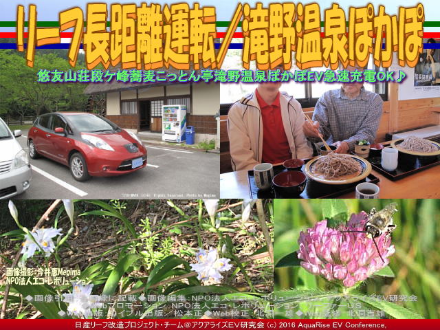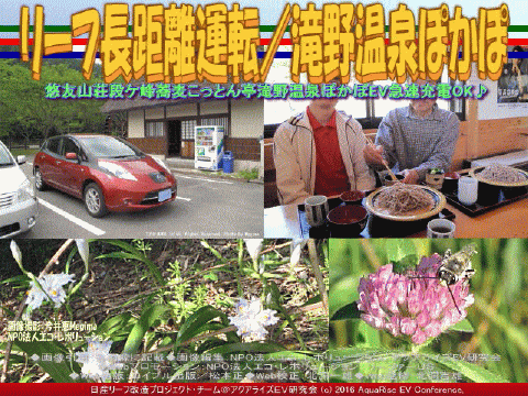 今回の紹介ブログは、『リーフ長距離運転/滝野温泉ぽかぽ』です。 前回(昨日)のブログ『リーフ長距離運転/段が峰千町峠』と姉妹編です。 ※本ブログは、私たちボランティア団体である当アクアライズEV研究会(別名:「EVリーフ改造」や「リーフEV研」や「リーフ改造研」や「リーフ改造EV研」や「EV研究会」や「EV研」や「AREV神戸」)が中心となって作成。特定非営利活動促進法に基づき法人格を得た団体(特定非営利活動法人)NPO法人エコ・レボリューション(NPO法人エコ・レボリューションCOMまたはNPO法人エコ・レボリューションNET、そしてNPO法人エコ・レボリューションINFO)の傘下で活動しています。 ※NPO法人エコ・レボリューションは、今乗っているガソリン車をEV電気自動車に乗り換えて、規制対象の排出ガス汚染物質の削減=ゼロエミッション活動を通じて「ストップ・ザ・地球温暖化」に地域レベルで貢献することを旨として、現在「乗換えにはEV、今こそ決断♪」を推進しています。
