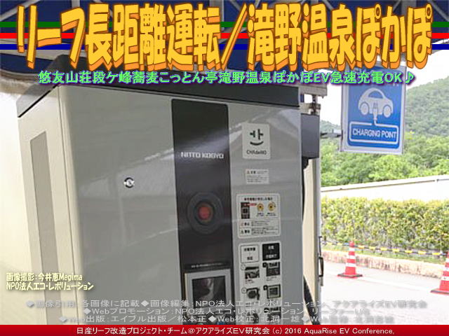 段が峰(※参照『リーフ長距離運転/段が峰千町峠』)から愛車ドレスアップ日産リーフ改造カスタムカー「ラプソディア号」でおりてきたら、電気もずいぶん増えていて、あ、なぜ増えるかというと、EV電気自動車日産リーフ特有の坂道下りの電気回生システムが働いて充電量を補給できる仕組みがあります。これはBMWi3EV版(『BMWi3EV型のスペック/エルベオート』『BMW電気自動車i3(6)/リーフEV研』『BMW電気自動車i3(5)/リーフEV研』『BMW電気自動車i3(4)/リーフEV研』『BMW電気自動車i3(3)/リーフEV研』『BMW電気自動車i3(2)/リーフEV研』『BMW電気自動車i3/リーフEV研』)やテスラS(『テスラ自動運転試乗(4)/幸田幸』『テスラ自動運転試乗(3)/幸田幸』『テスラ自動運転試乗(2)/幸田幸』『テスラ自動運転試乗/幸田幸』)より回生力があるような気がします。それで充電するほど減ってはいなかったけれど、とりあえず充電スポットがあればまず充電!EVに乗ってから身に付いた習慣で、前日に立ち寄って充電したコンビニ(『急速充電/ローソン神崎南インター店』『長距離運転/ローソン神崎南インター』)で、充電しました。電気はすぐにいっぱいになりました。 【リーフ長距離運転/滝野温泉ぽかぽ 01】  リーフ長距離運転/滝野温泉ぽかぽ画像01 悠友山荘段ケ峰蕎麦こっとん亭滝野温泉ぽかぽEV急速充電OK♪