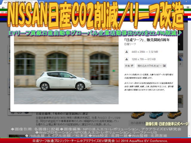 以上、NISSAN日産CO2削減/リーフ改造の各画像はクリックで全て640x480pxlsに拡大します。 ※本ブログページのすべての画像4枚をスライドショー480x360pxlsで見られます。 ※本ブログページ・3作トリオロジーでは、11枚の画像を320x240pxlsスライドショーで見られます。 |