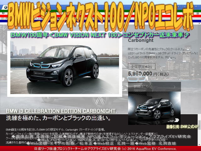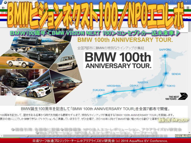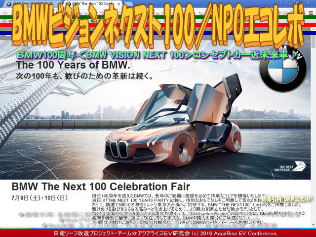 BMWは2016年3月7日に創業100周年を迎えたそうです。おめでとうございます。 ドイツBMW本社の創立100周年にあたり、BMWグループは様々なイベントを実施しました。BMWの次の100年を考えるコンセプトモデル「ビジョン ネクスト100コンセプト」が注目を浴びています。BMWの100年の歩みを振り返るだけでなく次の100年に向けてBMWが描くビジョンを体現させたコンセプト・カー「BMW VISION NEXT 100」について、公式ページを引用して紹介します。 【BMWビジョンネクスト100/NPOエコレボ 01】 画像01は、<BMWの軌跡。それは100年間、革新的なクルマづくりを追求し続けた情熱の歴史です。磨き上げた技術の粋を集め、次の100年へ向かうBMWの象徴として開発されたBMW VISION NEXT 100。この究極のコンセプト・カーに息づくBMWのスピリットは、今年国内で続々と登場する100周年記念モデル、BMW Celebration Editionでもご体感いただけます。またBMW誕生100周年という記念すべき年に、日本では東京ベイフロントに、BMWブランド体験型販売拠点「BMW GROUP Tokyo Bay」がグランド・オープンいたします。さらに東京を皮切りに、全国7都市で「BMW 100th ANNIVERSARY TOUR」も開催。あなたの駆けぬける歓びを、さらなる高みへ引き上げるために。BMWの未来への挑戦は、もう始まっているのです。>と案内されています。 【BMWビジョンネクスト100/NPOエコレボ 02】 画像02は、<次の100年にむけてBMWが描くヴィジョンを体現させたコンセプト・カー「BMW VISION NEXT 100」 BMW VISION NEXT 100 とは。これまでも駆けぬける歓びを実現する究極のクルマを生み出すことを目標に尽力してきました私たちは、より胸躍らせる歓びが味わえる未来のモビリティを生み出しました。それこそがコンセプト・カー「BMW VISION NEXT 100」です。>とあります。 【BMWビジョンネクスト100/NPOエコレボ 03】 画像03は、<7月9日、10日は、全国のBMW 正規ディーラーで「BMW The Next 100 Celebration Fair」開催 誕生100周年を迎えたBMWでは、長年のご愛顧に感謝を込めて特別なフェアを開催いたします。当日は「THE NEXT 100 YEARS PARTY」と称し、特別なおもてなしをご用意して皆さまをお出迎えします。さらに、抽選で5組10名様をヒルトン東京お台場へご招待する、BMW “THE NEXT100” Lotteryもご用意しました。駆けぬける歓びをさらなる高みへと引き上げるために、より魅力を際立たせた稀少モデルとして、特別な装備や仕立てを施した100周年記念モデル、“Celebration Edition”の数々とともに、BMWの歴史を彩ってきた名車を特別に展示。過去、現在、そして未来と、BMWの魅力を存分にご体感ください。100周年の歓びに満ちたこの特別な機会に、ぜひお近くのBMW 正規ディーラーへお越しください。>と続きます。実際、BMWヤナセ八尾(正式名:「ヤナセバイエルンモーターズ株式会社八尾支店 Yanase BMW 八尾)でも100周年フェアが開催されていました。 【BMWビジョンネクスト100/NPOエコレボ 04】 画像04は、<洗練を極めた、カーボンとブラックの出逢い。BMW誕生100周年を記念したBMWi3の限定モデル、Carbonight (カーボナイト)が登場。カーボン・ファイバー強化樹脂(CFRP)を採用した画期的なボディ構造で新時代の走りを実現するi3(レンジ・エクステンダー装備車)に、クールな都会の夜を思わせるフルード・ブラックのボディ・カラーと明るくモダンな印象のカラム・グレーのインテリア・カラーを組み合わせました。洗練された都市のクルージングに相応しい斬新な一台です。 ■BMW i3 Celebration Edition Carbonight(全国限定40台) ■5,980,000円(税込) ■ボディ・カラー: フルード・ブラック/BMW i ブルー・アクセント ■5ドア/右ハンドル/全長×全幅×全高 4,010×1,775×1,550mm/車両重量 1,390kg/最高出力(電気モーター) 125kW〔170ps〕/最大トルク(電気モーター) 250Nm〔25.5kgm〕 ちなみに、当NPOエコレボリューション(<エコレボNET><エコ・レボCOM><エコレボINFO>)は、BMWi3についてはレンジエクステンダー車でなくて、100%EV使用の「BMWi3EV」関連のブログを以下のようにアップしています。 151216『BMWi3(5)/大阪モーターショー2015』 151215『BMWi3(4)/大阪モーターショー2015』 151214『BMWi3(3)/大阪モーターショー2015』 151213『BMWi3(2)/大阪モーターショー2015』 151212『BMWi3/大阪モーターショー2015』 150714『EVメーカーのSDとCSR(3)EV研究会』 150713『EVメーカーのSDとCSR(2)/EV研究会』 150712『EVメーカーのSDとCSR/EV研究会』 150710『EVメーカーのCSR(3)/リーフEV研』 150709『EVメーカーのCSR(2)/リーフEV研』 150708『EVメーカーのCSR/リーフEV研』 150707『EVメーカーの急速充電(3)/リーフEV研』 150706『EVメーカーの急速充電(2)/リーフEV研』 150705『EVメーカーの急速充電/リーフEV研』 150704『BMWi3EV型のスペック/エルベオート』 150703『BMW電気自動車i3(6)/リーフEV研』 150702『BMW電気自動車i3(5)/リーフEV研』 150701『BMW電気自動車i3(4)/リーフEV研』 150606『EV電気自動車のASV(3)/リーフEV研』 150605『EV電気自動車のASV(2)/リーフEV研』 150604『EV電気自動車のASV/リーフEV研』 150603『EV電気自動車のQS(3)/リーフEV研』 150602『EV電気自動車のQS(2)/リーフEV研』 150601『EV電気自動車のQS/