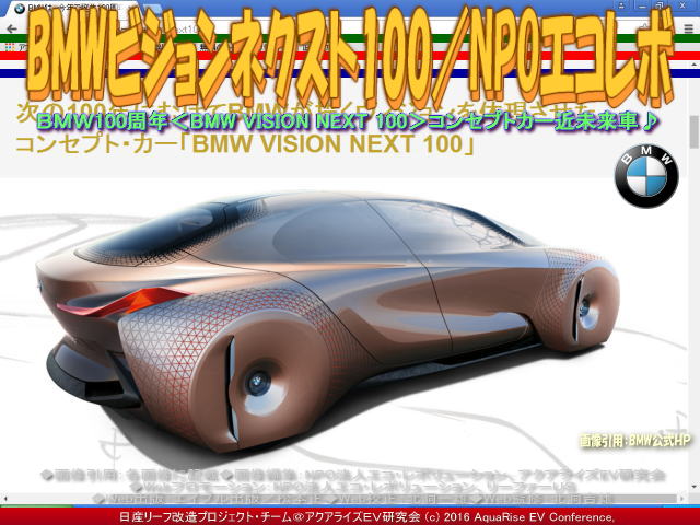 以上、BMWビジョンネクスト100/NPOエコレボの各画像はクリックで全て640x480pxlsに拡大します。 ※本ブログページのすべての画像4枚をスライドショー480x360pxlsで見られます。 |