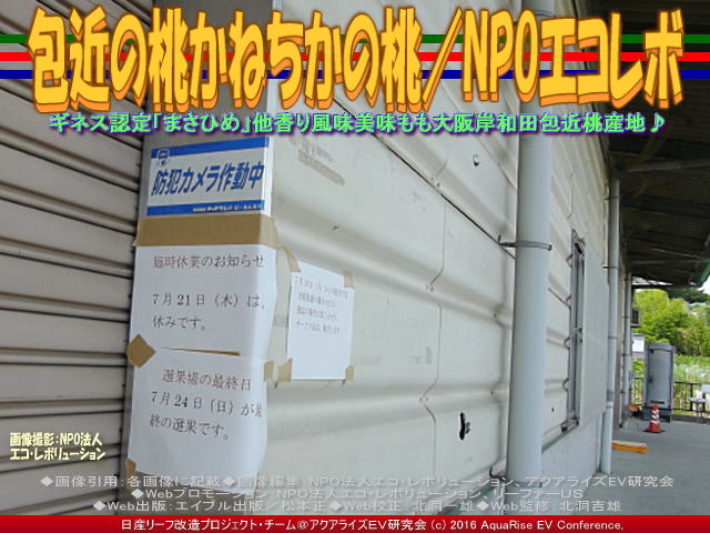 今日のお仕事は和歌山。神戸から、日産リーフ改造(ドレスアップ日産リーフ改造カスタムカー(『リーフカスタム見て見て!/リーフ改造』『カスタムカーLEAF/日産大阪岸和田南』『カスタマイズLEAF/日産リーフ改造』『リーフカスタムカー赤白黄色(3)/リーフ改造』)で和歌山の目的地に向かう途中、急速充電を行う必要があります。それに、ネット記事やニュースで評判の一個一万円以上するという<甘さ世界一「包近の桃」 岸和田の農家ギネス登録>の包近の桃(かねちかの桃)も見たかったし。あ、私初めから観るだけ、ジャスト・ウォッチング・イエス!Just Watching, Yes!です。 【包近の桃/リーフ改造NPOエコレボ 01】 それで、高速を岸和田和泉で降りて岸和田市包近町にある「包近桃選果場(かねちかももせんかじょう)」に向かいました。 7月23日土曜日のことです。 ・・・残念ながら、お休みでした。 遅ればせながら、早速ネットで調べました。 ■名称: 包近桃選果場 ■読み: かねちかももせんかじょう ■住所: 岸和田市包近町296-1 ■電話: 072-441-2304 ■即売時間: 午後1時半~4時頃(※早く終了する場合があります。) ■定休日: 例年、6月中旬より営業、土曜定休、不定期での休日があります。 ■備考: 電話は作業中は出れない場合があります。 ■紹介: 贈答にぴったり、岸和田ブランド認定の化粧深箱に入ったものや、ご家庭でいただくなら“選果もれ”のお買い得品の販売もあります! 【包近の桃/リーフ改造NPOエコレボ 02】 「平均糖度22.2度」という、2015年にギネス世界記録に認定された「世界一甘い桃」は、マルヤファームの松本隆弘氏の作品です。これを一度見たいという私の願望は簡単に挫かれました。 【包近の桃/リーフ改造NPOエコレボ 03】 それで、ネットであれこれ調査。すると、「包近の桃」とGoogle検索で、トップに<岸和田 包近(かねちか)の桃・みかん産地直販 - Biglobe>でインデクサされています。さすが世界一!表紙には<28年度より極上品(糖度15度以上)の本サイトでのネット販売は致しません。詳細につきましては下記「特定の販売所&納入先」をご覧ください。~中略~「マルヤファームの桃」ネット予約販売は終了いたしました。ありがとうございました。!!>とあります。 【包近の桃/リーフ改造NPOエコレボ 04】 それはそうでしょう。なにしろギネス認定の松本隆弘氏の桃は宣伝しなくても勝手に売れて当たり前です。・・・つづく ちなみに、この日神戸から乗って行った日産リーフは、いつも兵庫県で取材活動をしているドレスアップ日産リーフ改造カスタムカー赤い「ラプソディア」号 『リーフ改造ラプソディア(2)/AREV神戸』 『リーフ改造ラプソディア/AREV神戸』 『リーフ改造ラプソディア(3)/日産岸和田南』 『リーフ改造ラプソディア(2)/日産岸和田南』 『リーフ改造ラプソディア/日産岸和田南』 『リーフ改造ラプソディア(3)/和歌山日産』 『リーフ改造ラプソディア(2)/和歌山日産』 『リーフ改造ラプソディア/和歌山日産』 『リーフ赤ラプソディア(3)/リーフ改造』 『リーフ赤ラプソディア(2)/リーフ改造』 『リーフ赤ラプソディア/リーフ改造』 『リーフ赤S改造前(2)/リーフカスタム』 『リーフ赤S改造前/リーフカスタム』 ではなくて、黄色のジェムニーGEMNEAです。今までに以下のファイル 『黄リーフ充電日産高石店/リーフ改造』 『リニューアル・オープン/日産大阪和泉中央』 『決算セール/日産大阪泉大津店』 『リーフ黄色/日産大阪岸和田南』 『リーフ黄色/ジェムニー仕様』 『リーフシートカバー/黄色@リーフカスタム』 『リーフ大商談会/日産大阪岸和田南』 『リーフ大商談会(2)/日産大阪岸和田南』 『カーボン調ドルフィンアンテナ/リーフ改造』 『リーフRS-Rダウンサス(2)/リーフ改造』 『リーフTi2000ダウンサス(2)/リーフ改造』 等で紹介してあります。あわせてご覧いただければ幸いです。 |