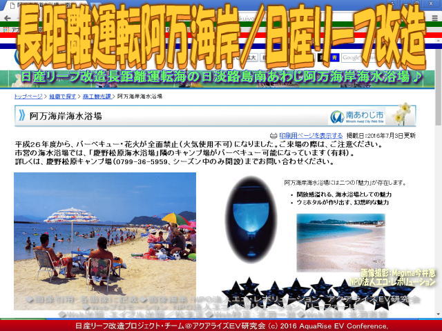 また、<阿万海岸海水浴場には二つの「魅力」が存在します。開放感溢れる、海水浴場としての魅力 ウミホタルが作り出す、幻想的な魅力>と紹介されています。>とも書かれています。ここの阿万海岸海水浴場にはもう一つ、海水浴ビジターにとってメリットがあります。いまどき駐車場代が無料でした。ウレシイです♪私たちリーフ改造ドレスアップカスタムコンプリートカー2台で行きましたが、泳ぐにも休むにも便利な場所を陣取ることができてラッキーでした。